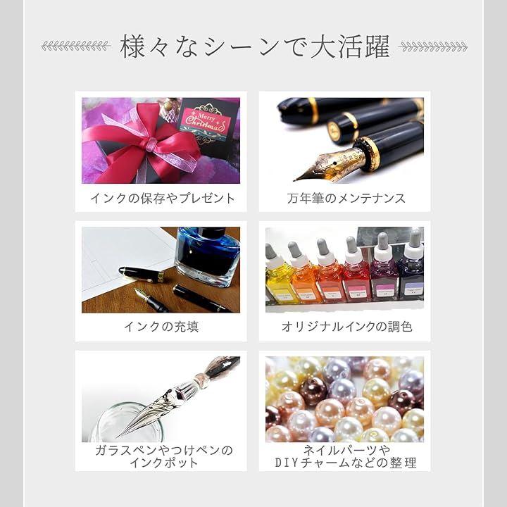 楽にインクの充填ができ、インクの劣化を防ぐことができるだけでなく、ガラスペン使用時のインクポットの代わりやお気に入りインクのシェア、オリジナルのインクを調色したい時にも便利な小瓶で、インク沼をお楽しみください。