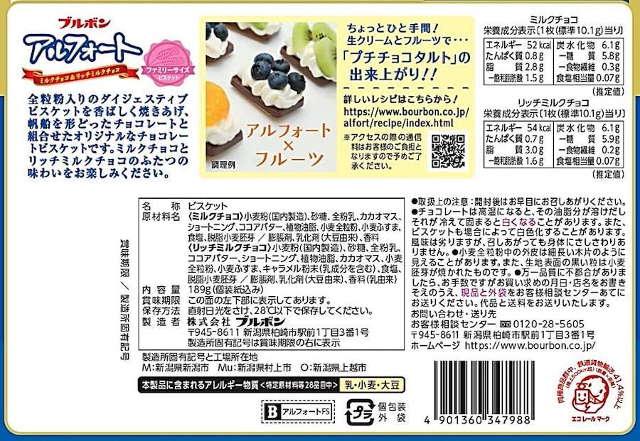 原材料:〈ミルクチョコ〉小麦粉(国内製造)、砂糖、全粉乳、カカオマス、ショートニング、ココアバター、植物油脂、小麦全粒粉、小麦ふすま、食塩、脱脂小麦胚芽/膨脹剤、乳化剤(大豆由来)、香料 〈リッチミルクチョコ〉小麦粉(国内製造)、砂糖、全粉乳、ココアバター、ショートニング、植物油脂、カカオマス、小麦全粒粉、小麦ふすま、キャラメル粉末(乳成分を含む)、食塩、脱脂小麦胚芽/膨脹剤、乳化剤(大豆由来)、香料(乳由来)