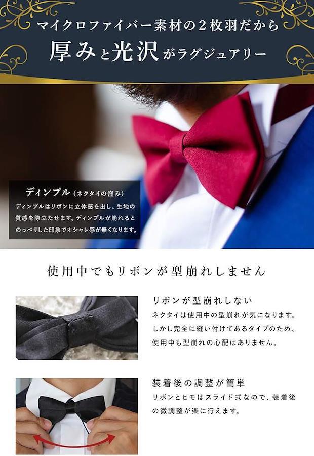 本製品は蝶部分が糸で縫い付けて固定され、紐部分をフックで装着出来るようにしたワンタッチタイプの蝶ネクタイです。