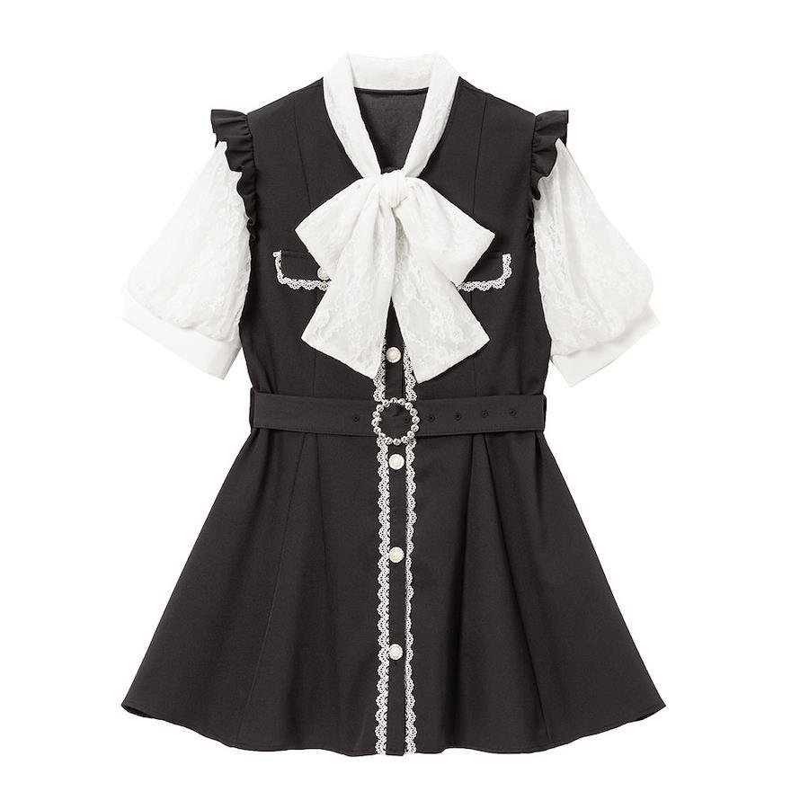 レースボウタイリボンデザインに袖のレースデザインがかわいいワンピース