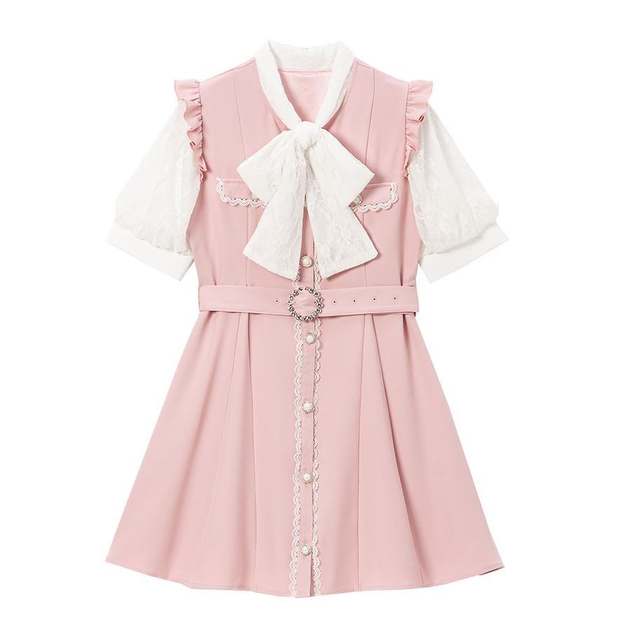 レースボウタイリボンデザインに袖のレースデザインがかわいいワンピース