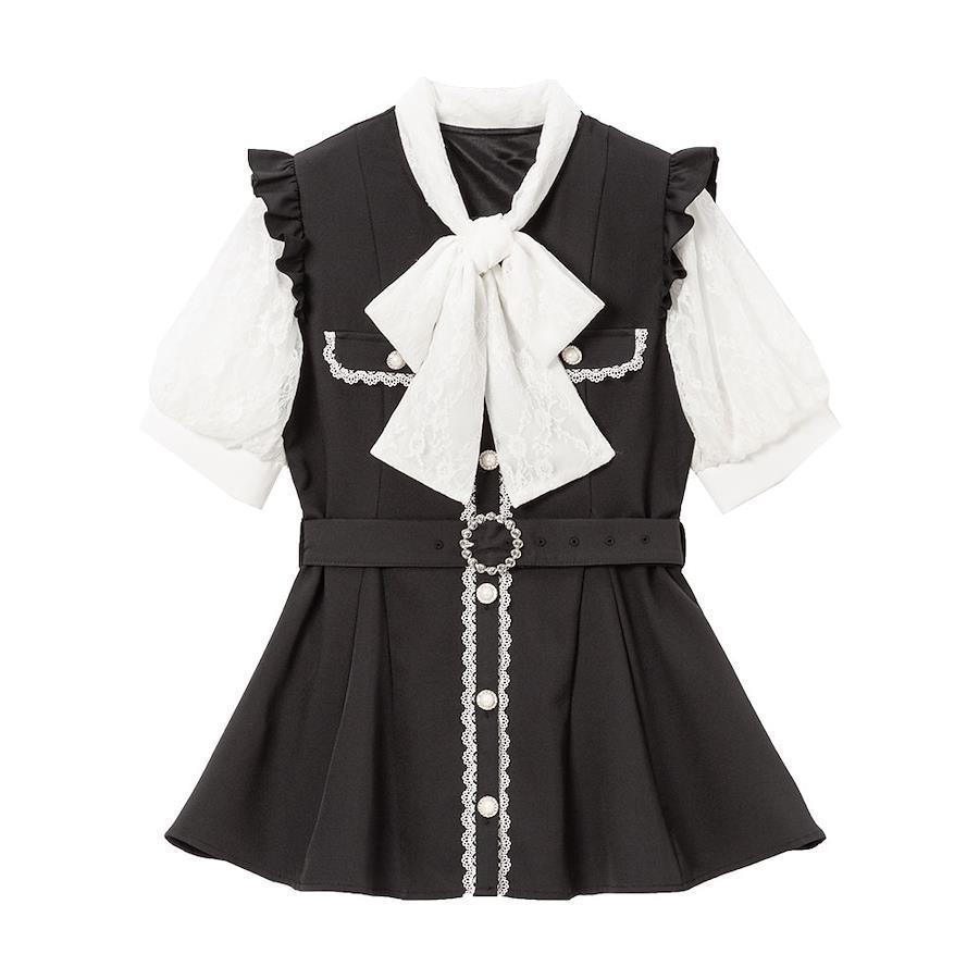 レースボウタイリボンデザインに袖のレースデザインがかわいいワンピース