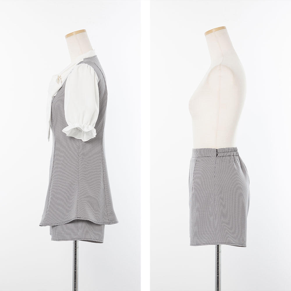 トップスは、襟元のボタンと左脇のファスナーを開けて、被りで簡単に着用いただけます。ボウタイリボンは、ご自身で結んでいただく仕様です。