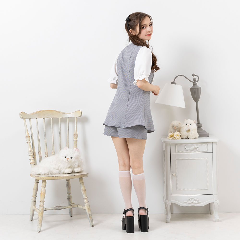 トップスは、襟元のボタンと左脇のファスナーを開けて、被りで簡単に着用いただけます。ボウタイリボンは、ご自身で結んでいただく仕様です。