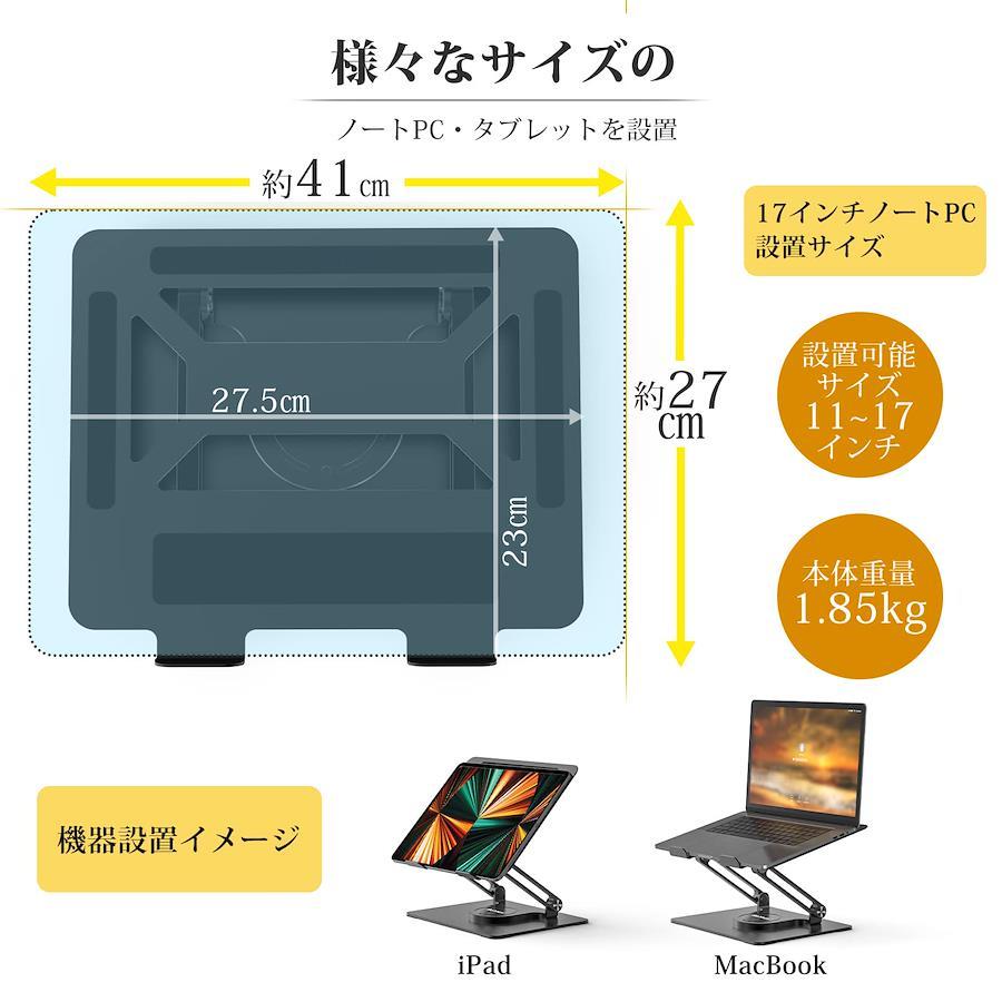 【360度回転&180°角度調整2ヶ所】BoYata N33パソコンスタンドはお使いの使用状況に応じて、ツール不要で天板をくるっと自由に360度回転できます。180°調整が2ヶ所あり、高さ・角度も多段階調節可能です。★同僚とデータを議論する際にスタンドを移動する必要がなく、回転するだけで向かい合う相手と簡単に画面を共有できるので、家族で映画を見たり、オフィスでの会議やプレゼンテーション、在宅デスク作業などに最適なノートパソコンスタンドです。 【無段階高さ調整&姿勢改善】BoYataパソコンスタンドは人間工学に基づいた設計により、高さが無段階調整(4CM-30CM)できます。PC作業時に自身を合わせて最適な高さと姿勢を整えて、首・肩・背中などへの負担が軽減されとともに猫背も有効に防止できます。 長時間のデスクワークが苦にならず、集中力も高まり作業効率UP!★注意:スタンドを高く上げた状態で、直接キーボードを打つと少し揺れる場合がありますので、別途キーボードをご用意することをおすすします。 【安定性抜群&シリコーン保護】BoYata PCスタンドは美しさと強さを兼ね備えている炭素鋼を採用し、最大5kgまで耐えることができます。★Z型デザインに加え、使用中に下がってくるようなことは無く、頑丈で安定します。★スタンドの底部・パソコンを支える部分にシリコン製の滑り止めパッドが付いているため、安定性を高め、ノートパソコン・タブレットに傷がつく心配はありません。圧倒的な安定性と機能性を是非、実感ください! 【収納便利&放熱性抜群】ノートPCスタンドの下に空きスペースを有効に活用して、書類を広げたり、使わない時のキーボート・USBハブ・メモ・ペン等を収納でき、デスク周りをスッキリ整頓します。★ノートパソコンとの接触面に通風穴を設けて、空気の流動性と放熱性を向上させているので夏場でも長時間作業しても熱が籠る心配が軽減されます。パソコンの使用寿命を延ばし、ノートパソコンはより速く運行することができます。 【高級感デザイン&幅広く対応可能】スタイリッシュなシルバーと滑らかなエッジ処理や艶消しされたマットボディは高級感を演出、Macbookとの相性はバッチリで、どこにおいても室内インテリアと合わせやすいPCスタンドです。★対応機種:MacBook Air、Macbook Pro、Microsoft Surface、Google Pixelbook、Dell、HP、Acer、ASUS、Lenovo、Alienwareなどの11~17.3インチのノートパソコン。★オフィス、会議室、コンサートホールなどのシーンに大活躍、友人や家族へのギフトにも最適です。