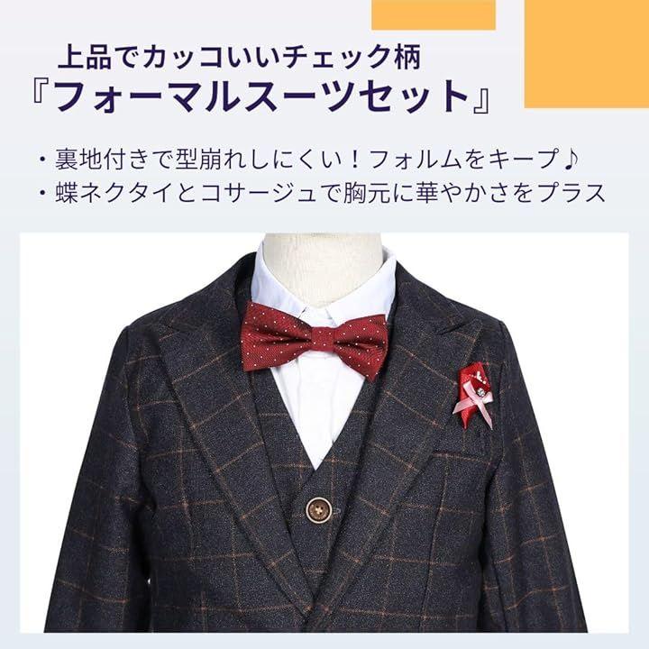 「男の子スーツ6点セット」ジャケット、ズボン、ベスト、白シャツ、蝶ネクタイ、コサージュ *裏地付き生地のスーツで、スタイリッシュなスーツスタイルになります。