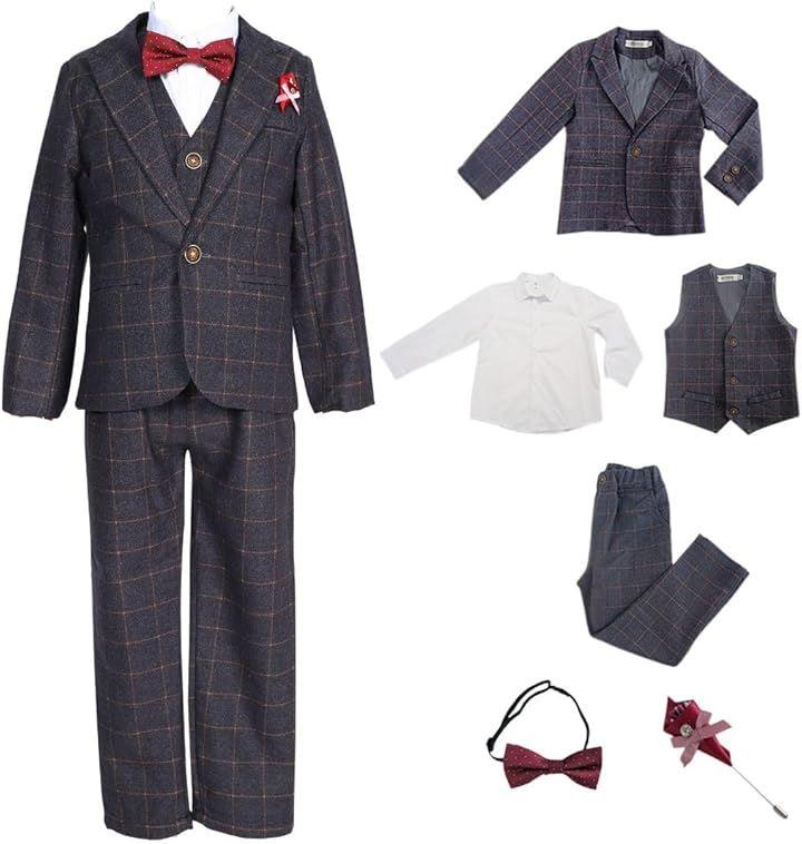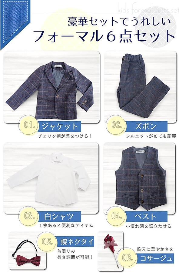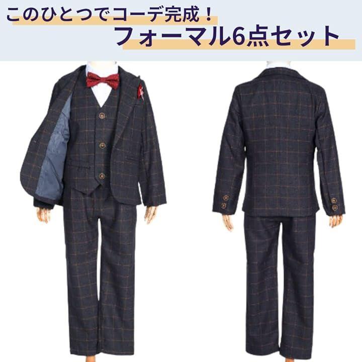 「男の子スーツ6点セット」ジャケット、ズボン、ベスト、白シャツ、蝶ネクタイ、コサージュ *裏地付き生地のスーツで、スタイリッシュなスーツスタイルになります。