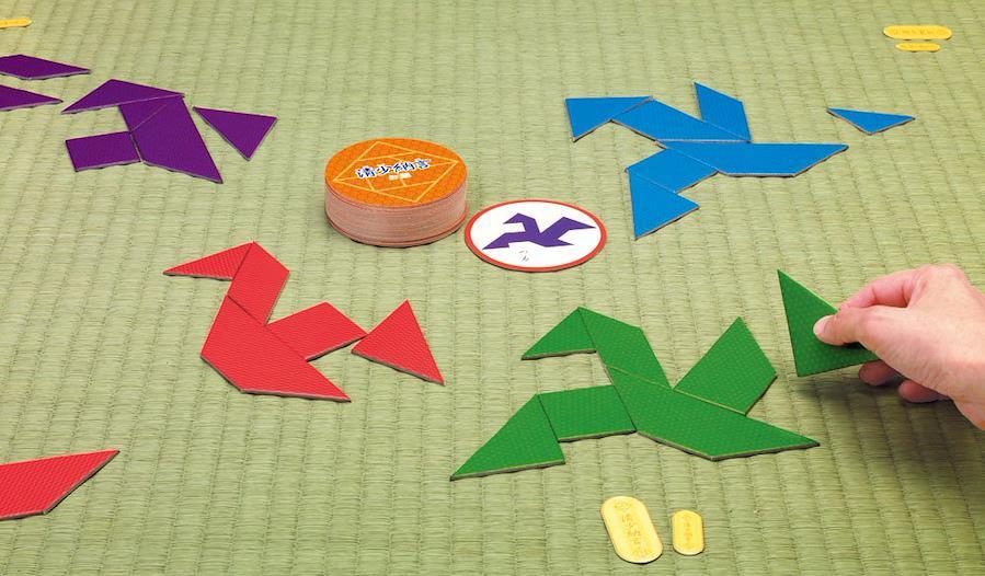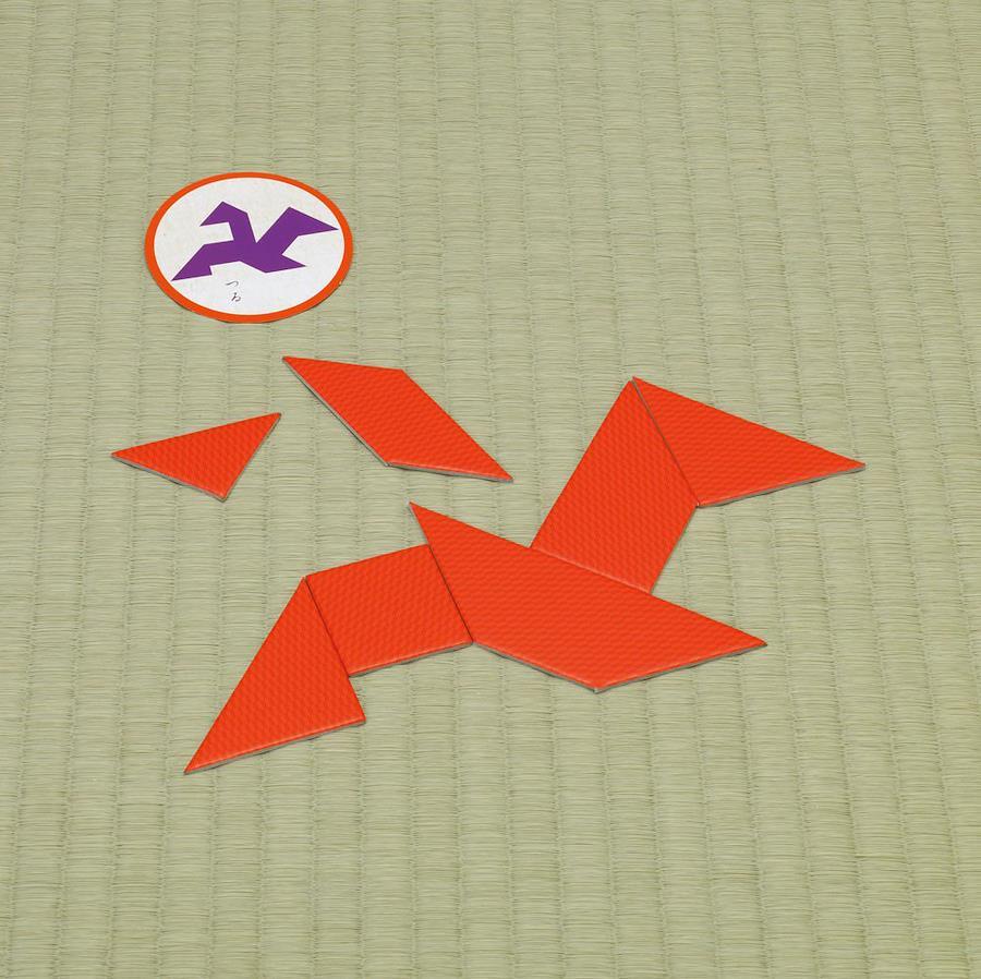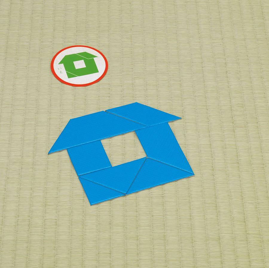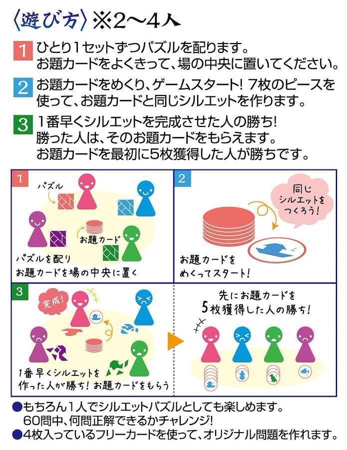 7枚のピースでお題のシルエットを作ろう! 1ひとり1セットずつパズルを配ります。お題カードをよくきって、場の中央に置いてください。2お題カードをめくり、ゲームスタート! 7枚のピースを使って、お題カードと同じシルエットを作ります。31番早くシルエットを完成させた人の勝ち! 買った人は、そのお題カードをもらえます。お題カードを最初に5枚獲得した人が勝ちです。※もちろん1人でシルエットパズルとしても楽しめます。60問中、何問正解できるかチャレンジ! ※4枚入っているフリーカードを使って、オリジナル問題を作れます。