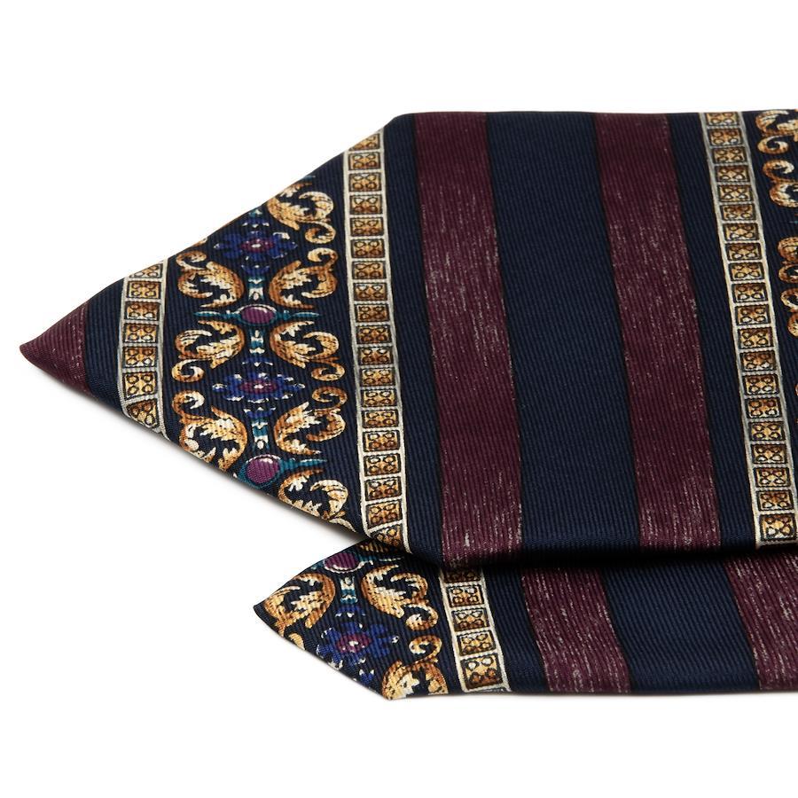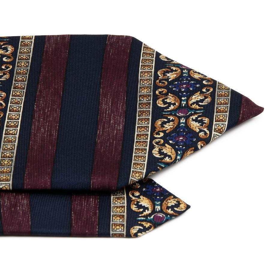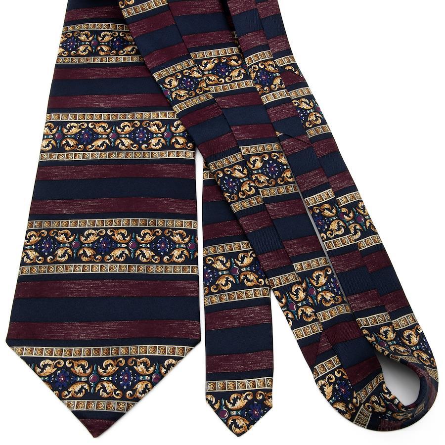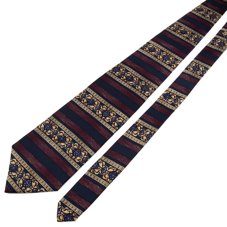 ネイビーブルーとワインレッドのホリゾンタルストライプに、美しい紋様が施されたエレガントなデザインとなっております。