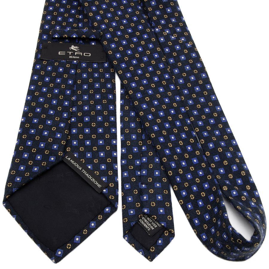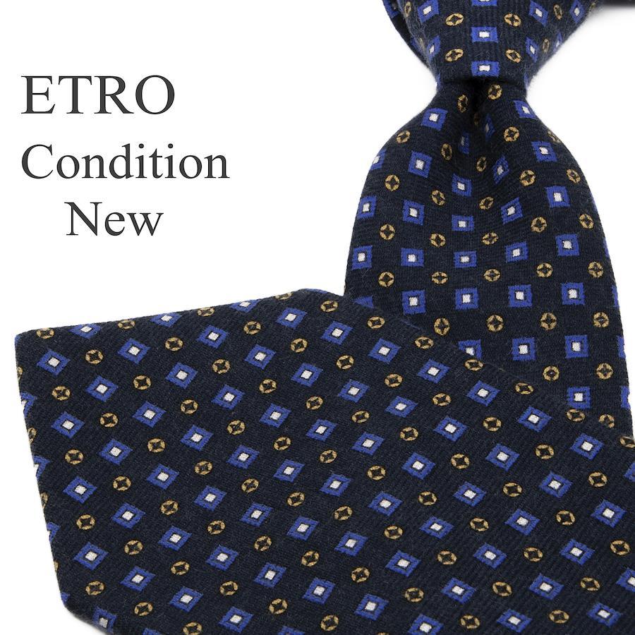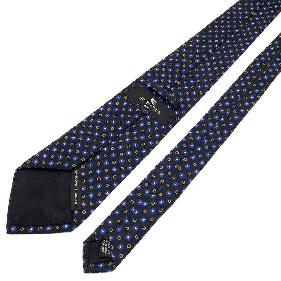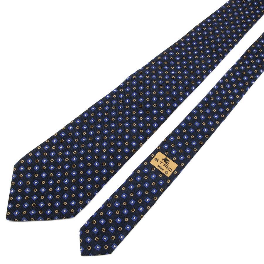 こちらは、ネイビー地に浮かぶ幾何学模様が洗練された個性を演出する、エトロのネクタイでございます。