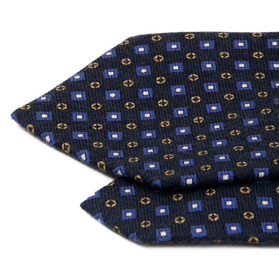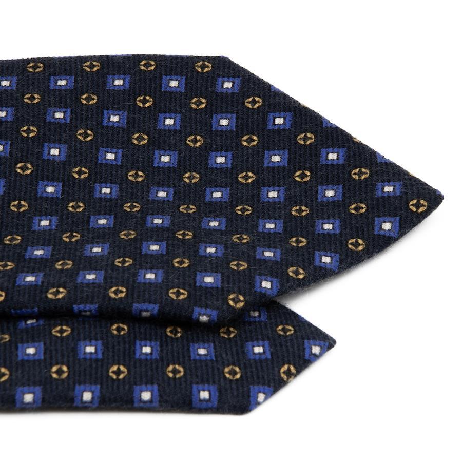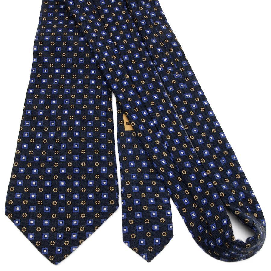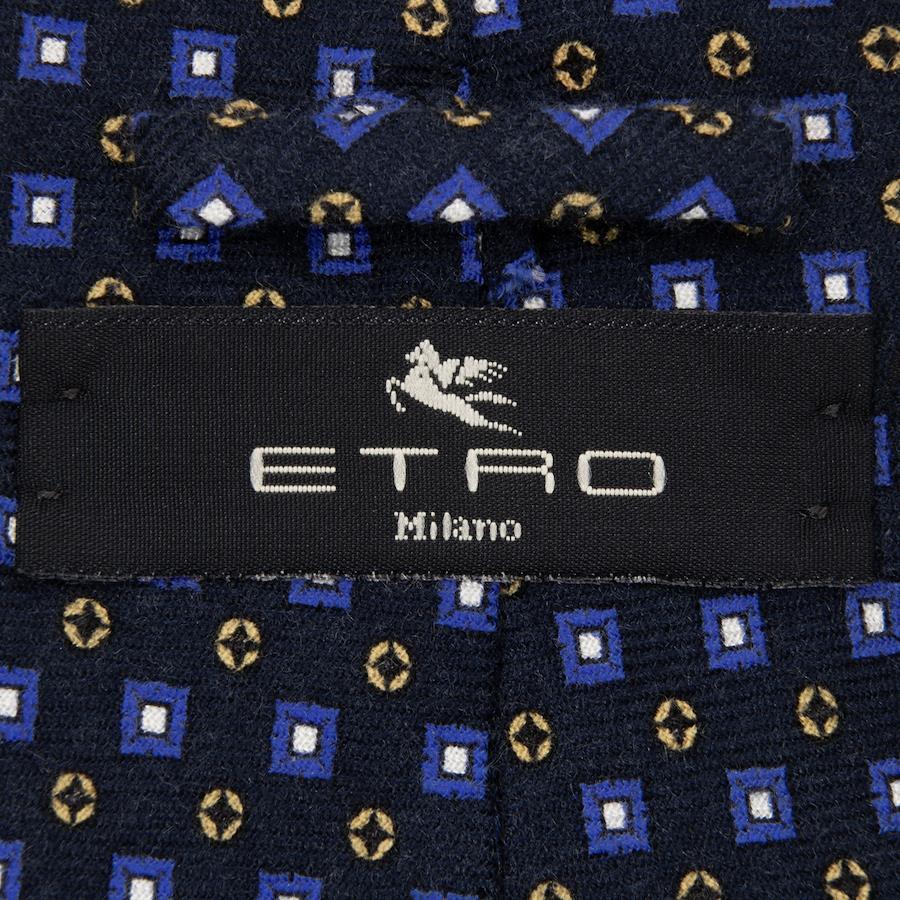こちらは、ネイビー地に浮かぶ幾何学模様が洗練された個性を演出する、エトロのネクタイでございます。