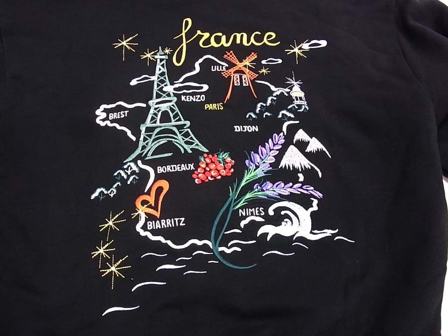片側にはフランスのポストカードマップイメージが刺繍され、もう片側には日本が刺繍されています。