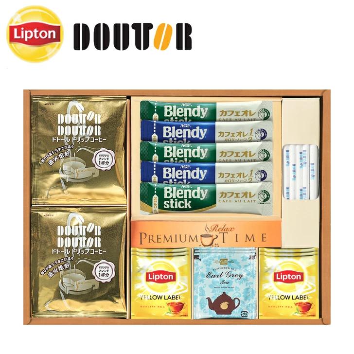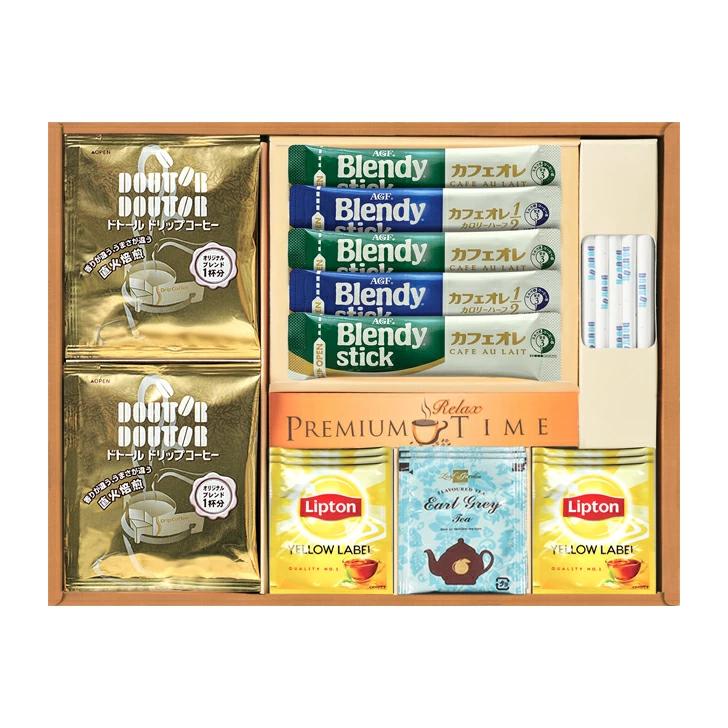 ドトールドリップコーヒー×8、リプトンイエローラベル×6、アールグレイ紅茶ティーバッグ、ブレンディスティックカフェオレ×各3、ブレンディスティックカフェオレ(カロリーハーフ)×2、ドトールスティックシュガー×15【乳】