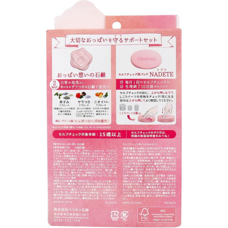大切なおっぱいを守るサポートセット♪●おっぱい想いの石鹸・2WAY・通常は泡洗い、気になるザラつきは石鹸で直洗い。・南仏・グラース産 シュガーローズの香り。●セルフチェック用パッド NADETE・毎月1回のセルフチェックに。・生理終了10日後がオススメ。・しこりパーツ3種 in。●セルフチェック対象年齢:15歳以上。