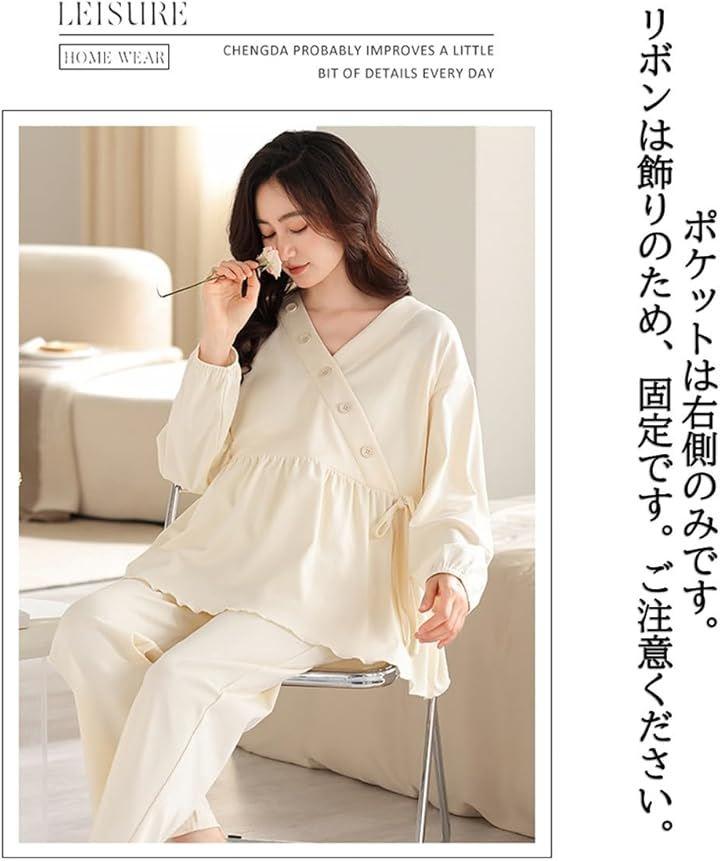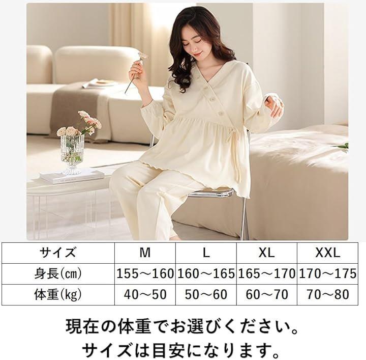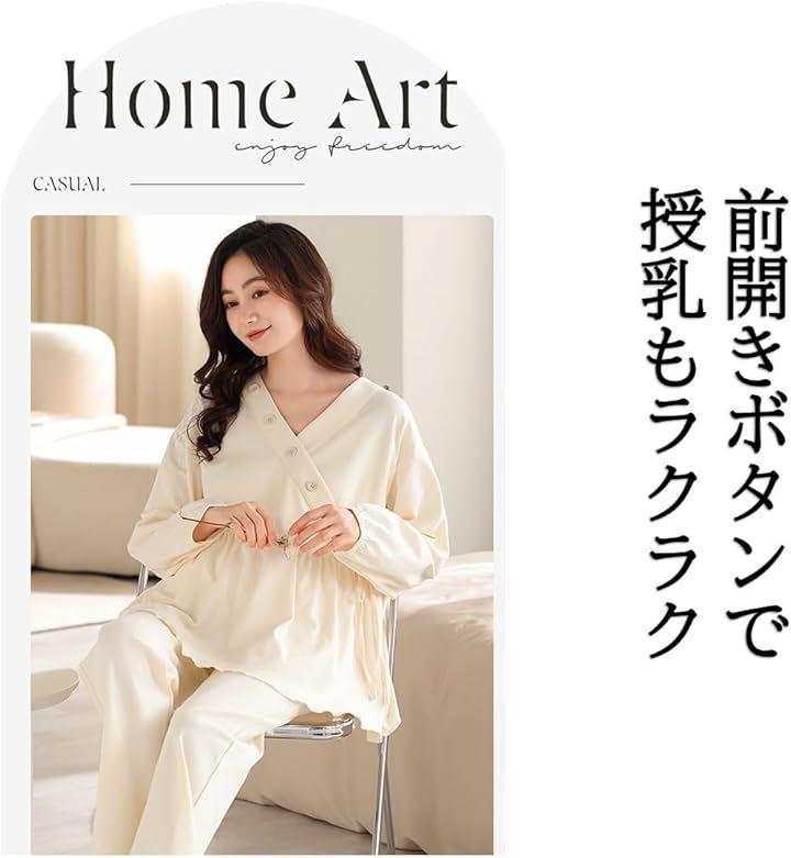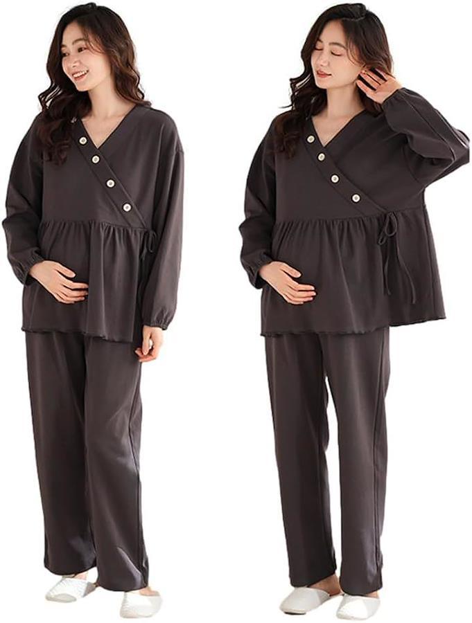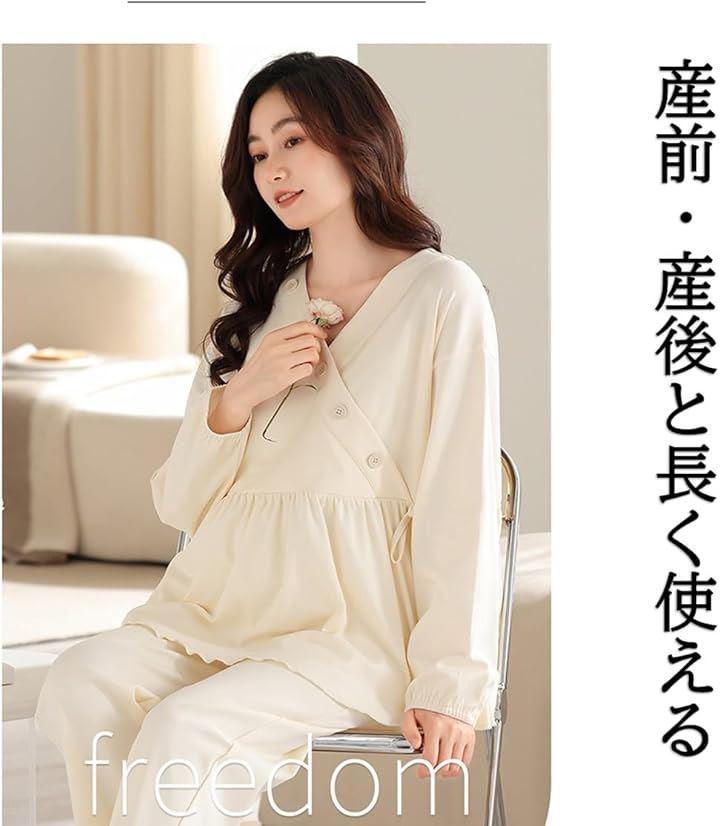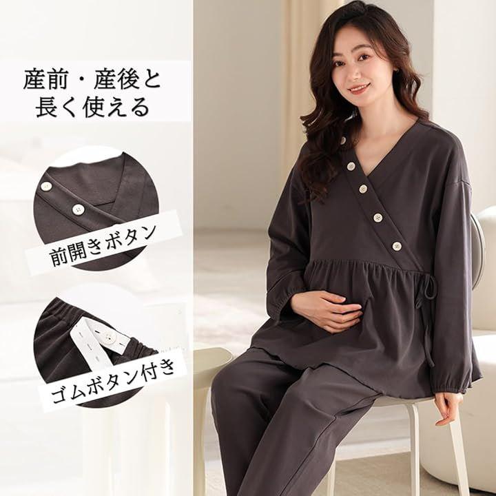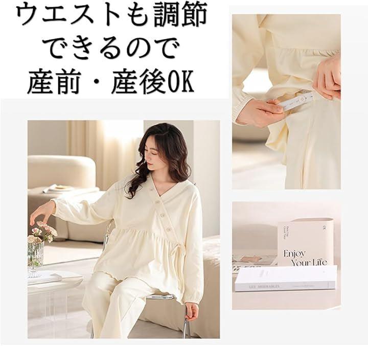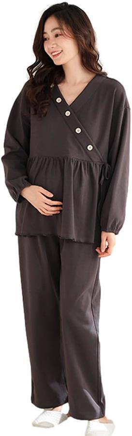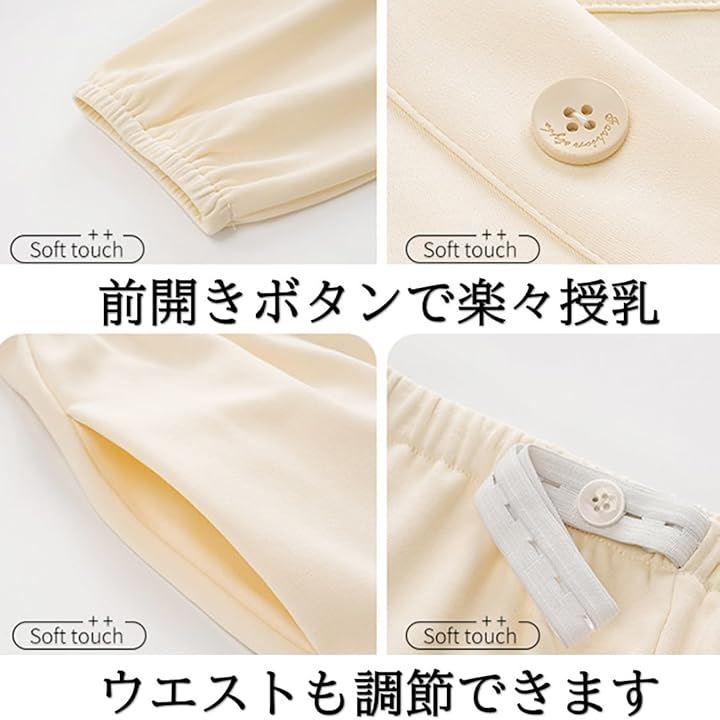 産前から産後までご使用いただけるこのパジャマは、前ボタンが付いているため、赤ちゃんの授乳もスムーズで安心です。