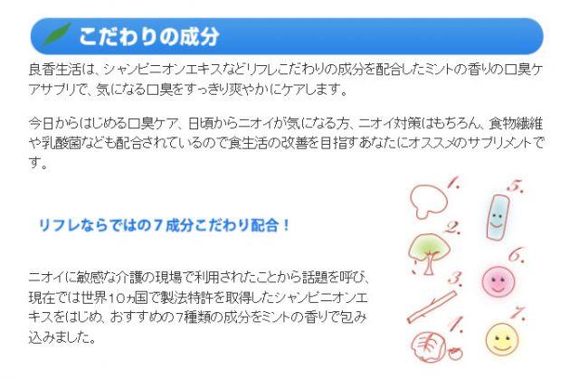 ミントの香りのエチケット良香生活93粒は、「良香生活」は、介護現場で利用されるマッシュルーム由来のシャンピニオンエキスをはじめ、植物由来のエチケット成分、フィットンチットやデオアタックなど合計7つもの話題の成分をミントの香りで包んだサプリメントです。
