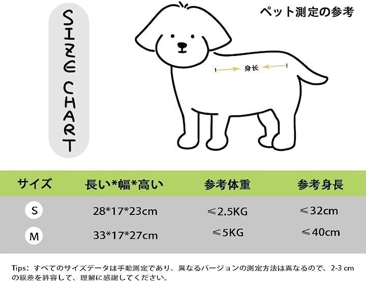 長さ:28cm、幅:17cm、高さ:23cm,身長32cm、体重2.5 kg以下の猫や犬に適しています。
