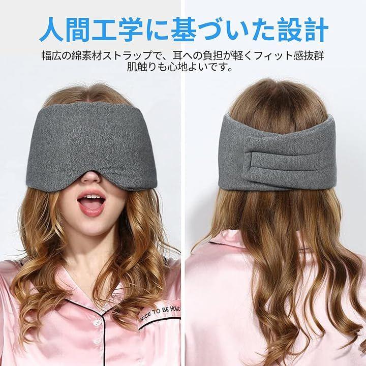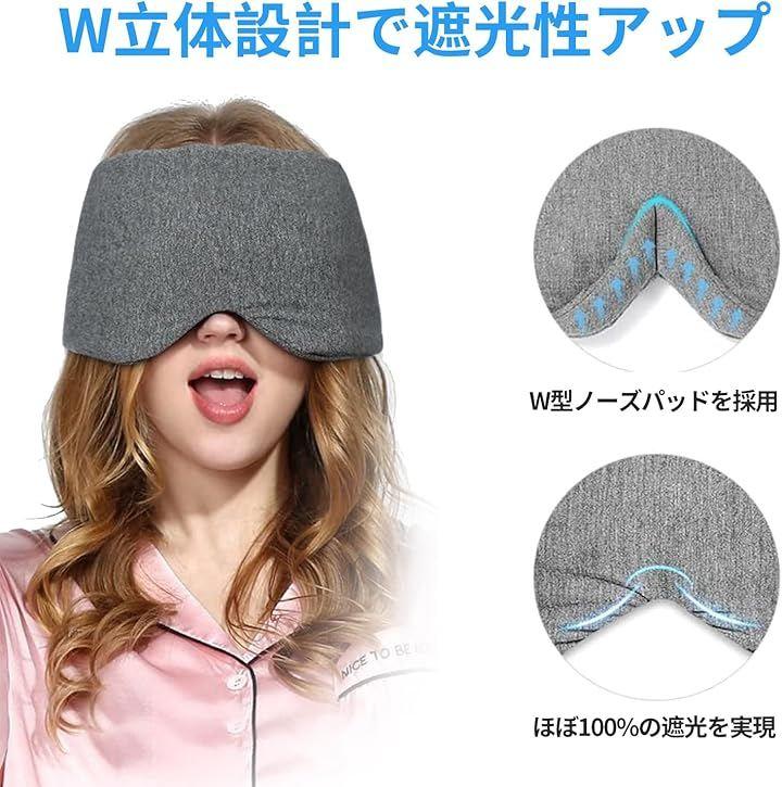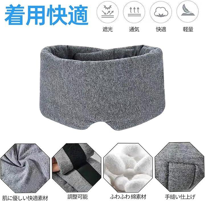 「全包み設計で光をしっかりカット。快適な睡眠・休息を」 顔の形にフィットする柔らかな全包囲デザインのアイマスク。