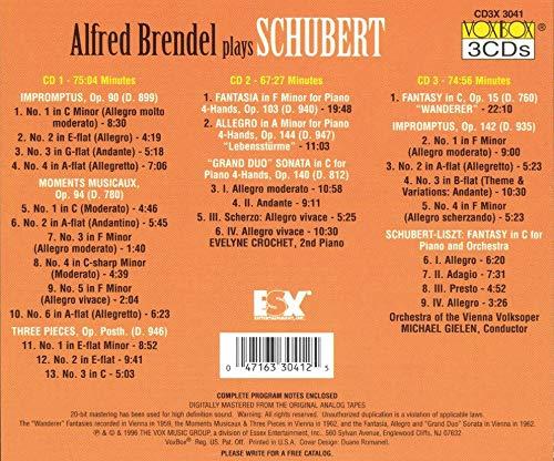 Alfred Brendel is not the most expressive Schubert player in the world on records,. But these early Vox recordings generally find him in good form, communicative enough to make an experience out of the Impromptus, for example. His duets with Evelyne Crochet are so gentle in their outlook that they sometimes almost fade from view, making it difficult to concentrate on the music (not Schubert's fault). I doubt that I'd recommend these performances if they weren't bargains. But the set is very inexpensive. So while other pianists give the ultimate Schubert performances, these discs are still worth their cost. --Leslie Gerber