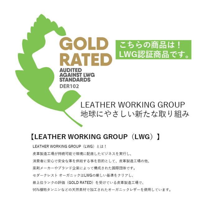 【LEATHER WORKING GROUP/レザーワーキンググループ(LWG)】とは皮革製造工場が持続可能で環境に配慮したビジネスを実行し、消費者に安心で安全な革を供給する事を目的として、皮革製造工場の他、薬剤メーカーやブランド企業によって構成された国際団体です。セダークレスト オーガニックはLWGの厳しい基準をクリアし、最上位ランクの評価(GOLD RATED)を受けている皮革製造工場で、95%植物タンニンなどの天然素材で加工されたオーガニックレザーを使用しています。