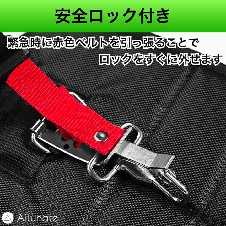 転倒や体勢が崩れた際の緊急時に赤色ベルトを引っ張ることでロックをすぐに外せます。