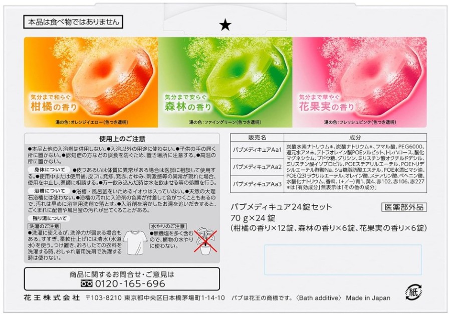■ Precautions· 1回のご入浴には1錠のみ使用してください(薬用濃度は1錠分に設定されています)· 使用後は浴槽をよく洗い流してください(着色防止のため)· 心臓病・高血圧・皮膚疾患のある方は使用前に医師にご相談ください· 湿気を避け、涼しく乾燥した場所に保管してください(湿気による早期発泡を防ぐため)