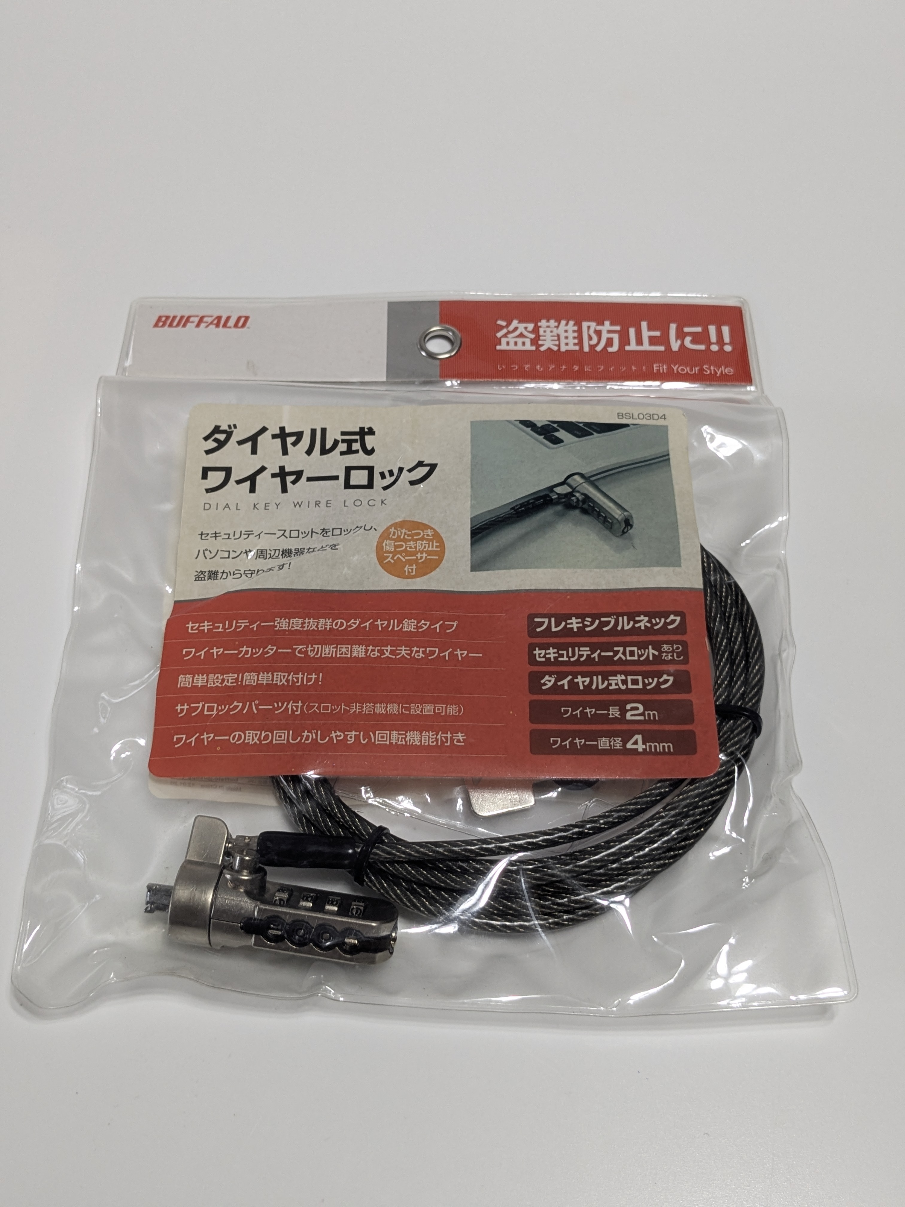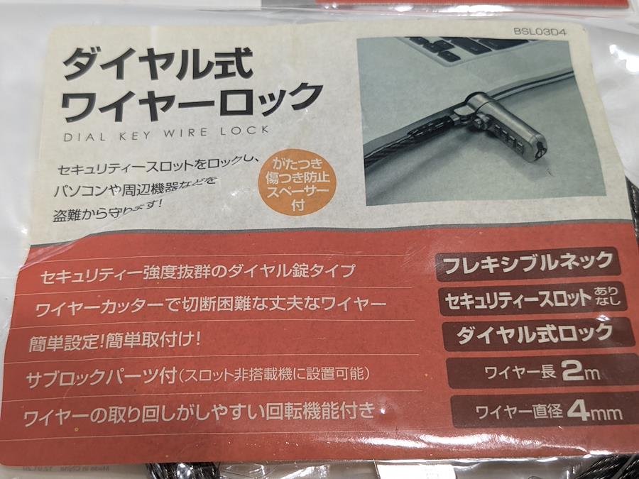 バッファロー BUFFALO ダイヤル式ワイヤーロック 2m BSL03D4 盗難防止【商品の特徴】信頼の国内メーカー「バッファロー(BUFFALO)」製のセキュリティワイヤーロックです。ノートパソコンや周辺機器をデスクなどに固定し、盗難を未然に防ぎます。カギ不要の4桁ダイヤル式:好きな番号に設定可能。カギを持ち歩く必要がなく、紛失の心配もありません。取り回しやすいフレキシブルネック:ロック頭部が回転・首振りするため、ワイヤーが邪魔にならず、狭い場所でもスムーズに取り付けられます。機器を傷つけないスペーサー付き:厚みの異なるスペーサーが付属しており、機器とのガタつきを抑えて傷を防止します。スロットがない機器にも対応:付属のサブロックパーツを使用すれば、セキュリティスロットがない機器にも巻き付けて設置可能です。【製品仕様】型番:BSL03D4ワイヤー長:2.0mワイヤー径:4mmパッケージ内容:本体、取扱説明書、スペーサー3種、設定キー、サブロックパーツ