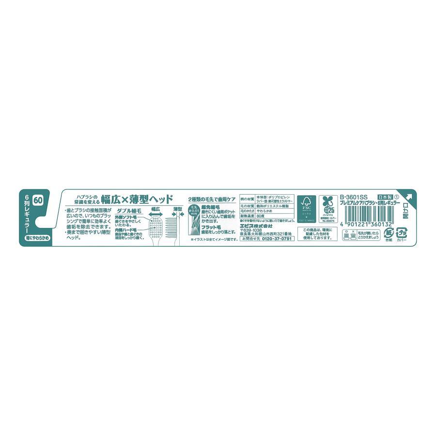 〇商品説明ハブラシの常識を変える幅広ヘッドの「プレミアムケアシリーズ」がパッケージリニューアル。ヘッドサイズと毛の硬度表示をより分かりやすいデザインに変更。ヘッドの厚さが当社従来品より約25%薄くなり口の中で動かしやすい薄型設計。超先細毛とフラット毛の2種類の毛先で歯周ケア。外側ソフト毛で歯ぐきをやさしくいたわり、内側ハード毛で歯面や歯と歯ぐきの境目をしっかり磨く。効率よく磨ける6列レギュラーヘッド。