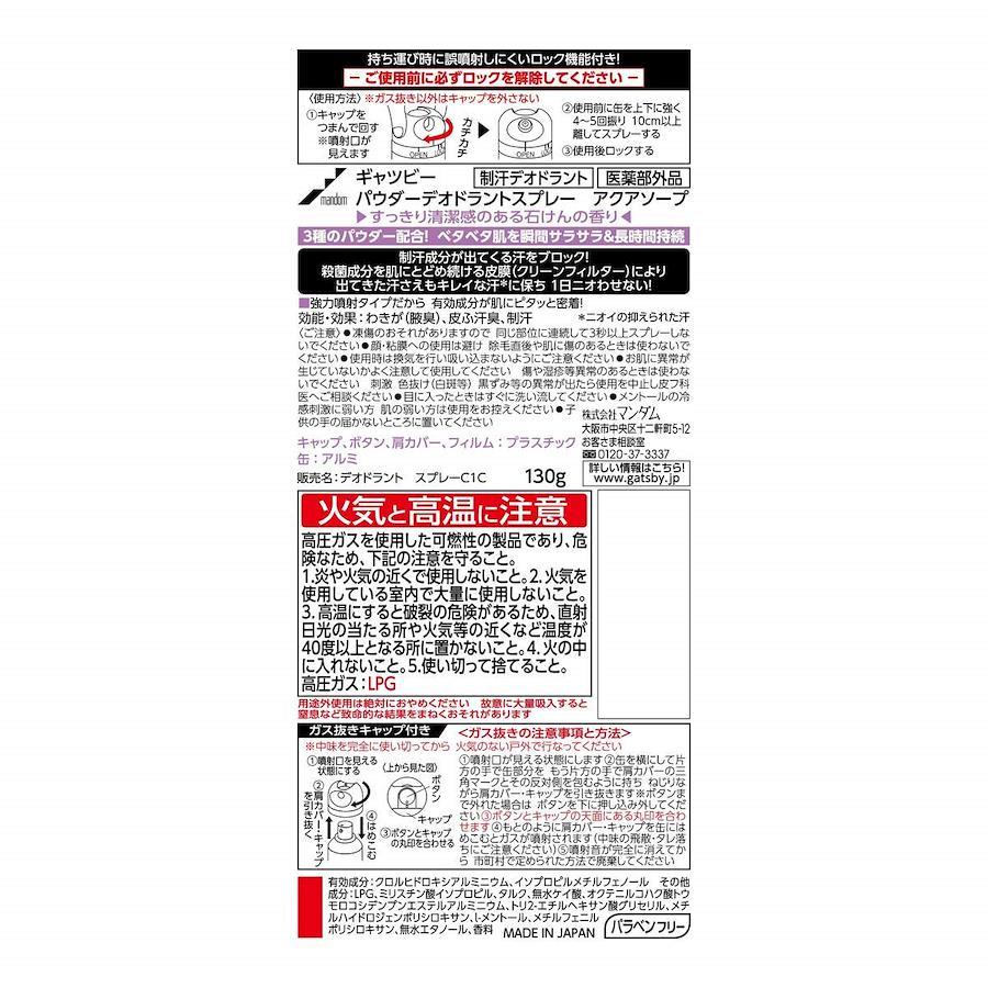 〇商品仕様GBパウダーデオドラントスプレー アクアソープ×3点セット単品サイズ50×193×50(mm)容量130G(出典:マンダム)
