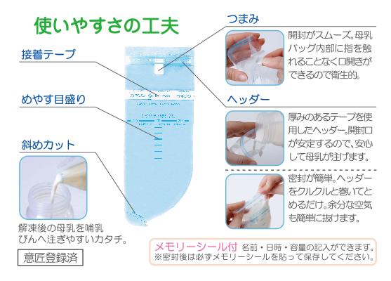 【ご使用方法】新生児は細菌に対して抵抗力が弱いので、お取り扱いは清潔にお願いします。手指を石けんでよく洗ってから母乳バッグを取り扱ってください。①上部の透明部分の切り込み口をヘッダーにそって引き裂きます。※ヘッダーをはがさないでください。②ヘッダーの中央部を白いつまみ側に折り目を付けてから、ヘッダーの両端を持ちます。③白いつまみを手前に引っ張り、母乳バッグの口を開けます。※母乳バッグ内に指を入れたり、息を吹き込んだりしないでください。④ヘッダーの両端を持ちながらもう一方の手で母乳バッグの下部を引っ張り、底まで広げてください。⑤片手でヘッダーの両端を持ち母乳バッグの口を開けたままコップの中で受けて、母乳をゆっくり注いでください。※最大容量表示のライン以上入れないようにしてください。破れや漏れの原因となります。(めやす目盛りは、白いつまみを持って自然にたまった状態での表示ですが、あくまでめやすですので正確ではありません。)⑥母乳バッグの空気を抜き、ヘッダー部分を接着テープにむかって手前に3回巻き込みます。(※25mlの場合は2回巻き込みます。)つぎに接着テープ部分のはくり紙をはがし、さらに1回巻き込み、しっかり押さえてとめてください。⑦あらかじめ名前とさく乳日時、容量を記入しておいたメモリーシールを⑥でしっかり押さえとめた部分の上にしっかりと貼ってください。そして速やかに冷凍庫(冷蔵庫)で保存してください。※冷凍庫で保存する場合は、母乳バッグ表面の水滴をよく拭き取り、1個ずつラップやポリ袋に包んでください。(庫内にくっつき取り出せなくなったり、冷凍庫内の他の食品類とくっついてしまい、フィルム外側のナイロン層がはがれてしまうことがあります)