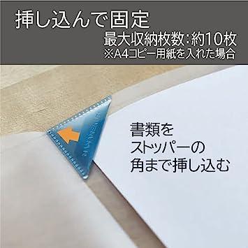 【商品特徴】ホチキス留めの感覚で、書類をナナメにめくれるファイルに入れたまま閲覧・記入・押印できる○クリップ・ストッパーに書類を差し込むだけで収納したままナナメにめくれる・書類を書類ストッパーの角まで挿し込み、ファイルは上からクリップで固定するだけ。書類を収納したまま、まるでホチキス留めされた資料のようにナナメにめくって閲覧・記入・捺印ができます。タテ向き・ヨコ向きどちらでも使用できます。サイズはA4サイズです。最大収納枚数:約10枚※※A4コピー用紙を入れた場合
