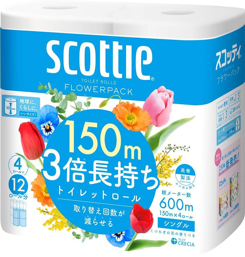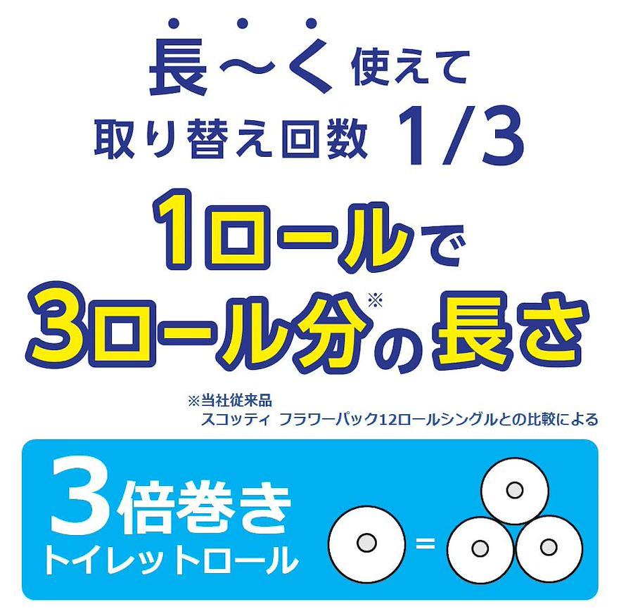 〇商品説明●たっぷり使えて取り替えの手間を軽減●省スペース化で保管もスッキリ●ロール幅108mmのエコサイズ●くつろぎの花の香りつき●当社独自の長巻製法とエンボス加工により、長持ちとやわらかさの両立を実現●従来品スコッティ フラワーパック12ロール(シングル)との比較