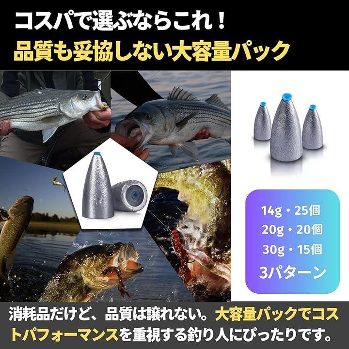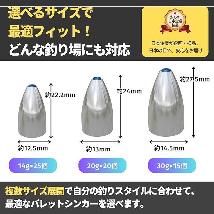 「遠投性抜群のバレット形状」 バレット形状のオモリは、空気抵抗を抑え、より遠くまでキャスティングが可能です。