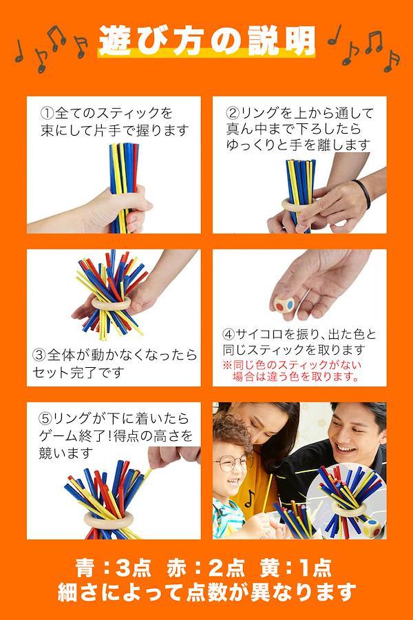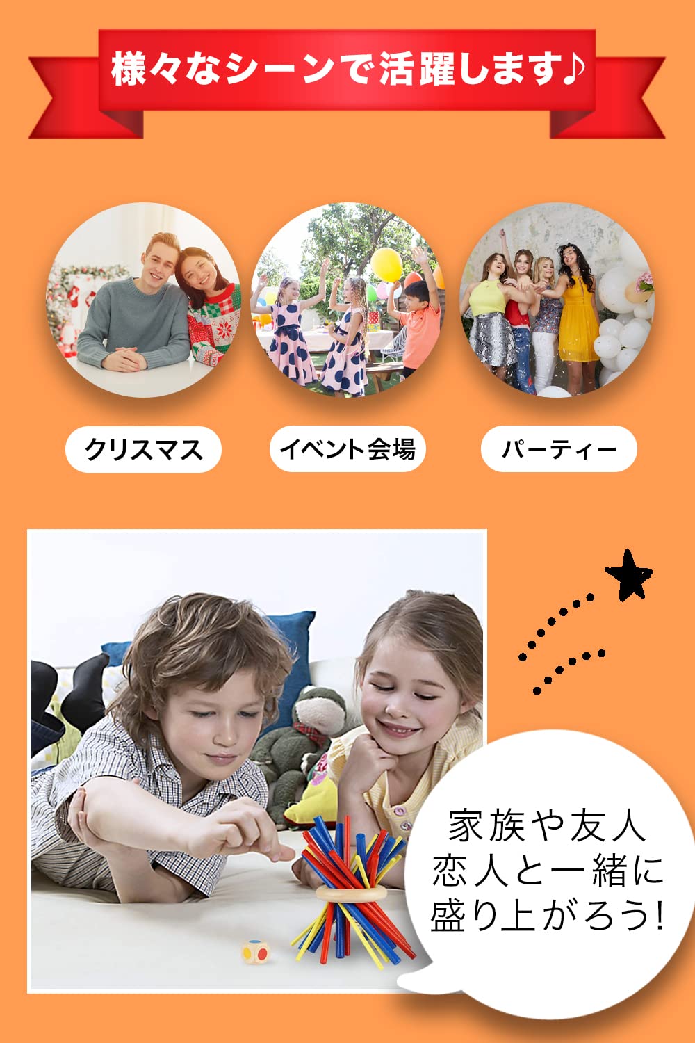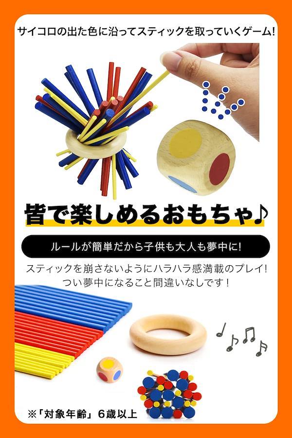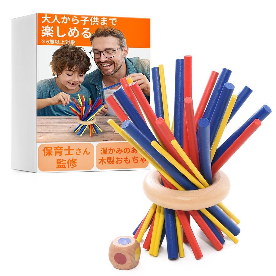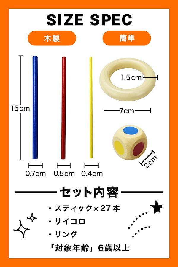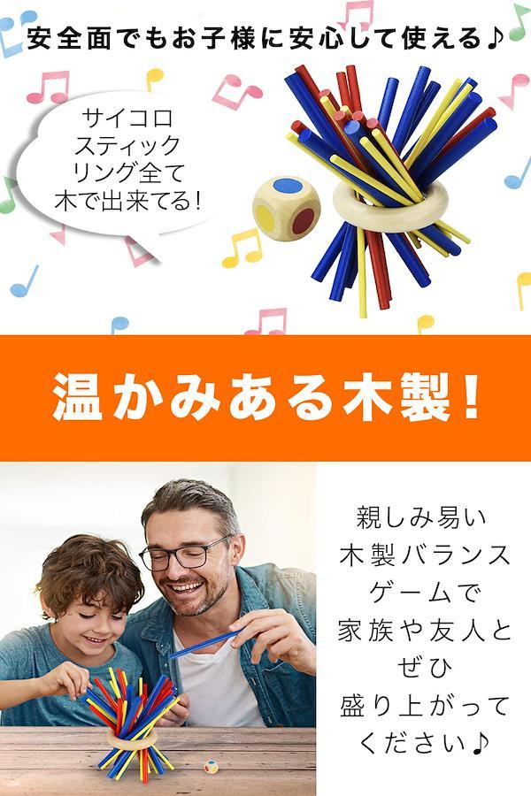 【 みんなで楽しめるゲーム♪ 】 サイコロの出た色に沿ってスティックを取っていくゲーム♪ ルールはいたってシンプルなので、子供も大人も老若男女問わず楽しめるゲームとなっております♪ 組んだスティックが崩れないように慎重にプレイするハラハラ感があるので、つい夢中になること間違いなしです! 【 温かみある木製 】 サイコロ、スティック、リング全て木で出来ているため、温かみがあり、安全面でもお子様に安心してご使用いただけます。親しみやすい木製バランスゲームで家族や友人とぜひ盛り上がってください♪ 【 様々なシーンで活躍します♪ 】 家族や友人、恋人とお正月、クリスマス、ホームパーティー、イベント会場など様々なシーンでお楽しみいただけます♪ 【 商品仕様 】●「素材」木製 ●「サイズ」画像にてご確認ください。●「セット内容」スティック×27本、サイコロ、リング、取扱説明書 ●「対象年齢」6歳以上 【 遊び方 】 ①全てのスティックを束にして片手で握ります。②リングを上から通して真ん中まで下ろしたら、ゆっくりと手を離します。③全体が動かなくなったらセット完了です。④サイコロを振り、出た色と同じスティックを取っていきます。※同じ色のスティックがない場合は違う色のスティックを取ります。⑤リングが下に着いたらゲーム終了で、一番得点が高い人の勝利です!●青:3点 赤:2点 黄:1点 細さによって点数が異なります。 【 30日間の返金保証付き 】 購入日から30日間の返金保証をつけさせていただいておりますので、安心してお買い求めください。