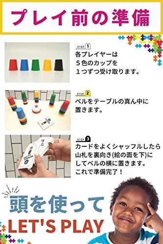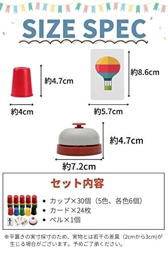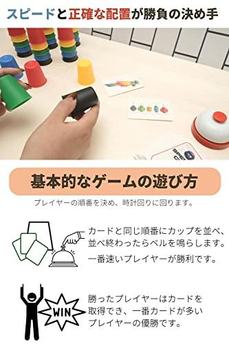 【 親子で遊べる】 本製品は、子どもから大人まで遊べる、スピードと正確な配置が勝負の決め手のアナログゲームです。2~4人で遊べるので、お友だちやご家族でコミュニケーションを取りながら頭を使うゲームができます。 【 プレイ前の準備 】 各プレイヤーは5色のカップを1つずつ受け取り、ベルをテーブルの真ん中に置きます。カードをよくシャッフルしたら、山札を裏向き(絵の面を下)にしてベルの横に置きます。これで準備完了です! 【 基本的な遊び方 】 プレイヤーの順番を決め、時計回りに回ります。カード引いて、同じ順番でカップを並べ、並べ終わったらベルを鳴らし、一番速いプレイヤーが勝ちです。勝ったプレイヤーはカードを取得でき、カードが多いプレイヤーが優勝となります。 【 商品仕様 】 ●「セット内容」カップ×30個(5色、各色6個)、カード×24枚、ベル×1個※ベルの色は生産時期により画像のカラーと変更になる場合がございます。●※お客様のモニター環境等により、実際の物と素材感、色が多少異なる場合がございます。予めご了承ください。 【 30日間の返金保証付き 】 購入日から30日間の返金保証をつけさせていただいておりますので、安心してお買い求めください。