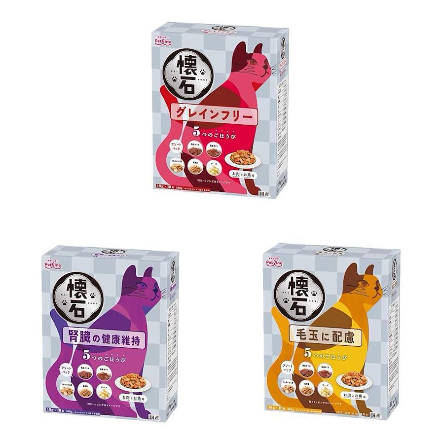 ペットライン 懐石 5つのごほうび 腎臓の健康維持 キャットドライ グルメ【 国産/小分け/トッピング】 180g今までの懐石を超える"至福の美味しさ"。毎日のごはんや、とっておきのおやつ、トッピングにおすすめ。それぞれトッピングされた5種類の小分けアルミ蒸着分包が、18g×10本入りで美味しさをキープ。酸化を防ぎ風味を保つ脱酸素剤入り。