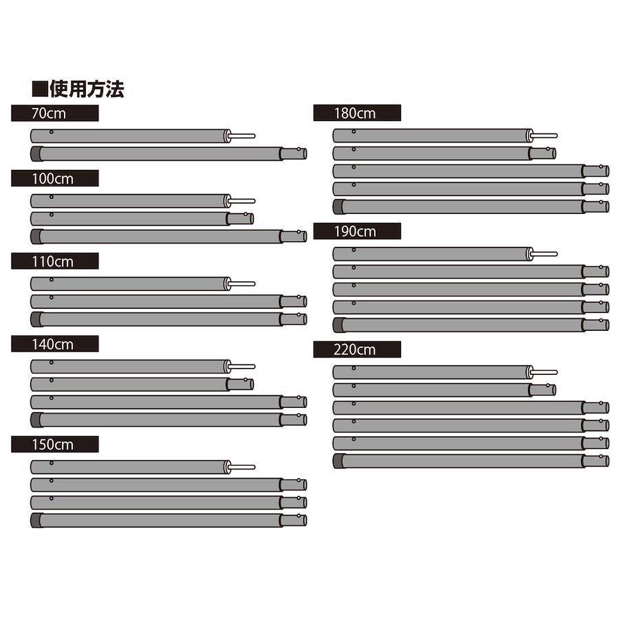組合せ高さ/約70cm、100cm、110cm、140cm、150cm、180cm、190cm、220cm 6本つなぎ材質/アルミニウム合金ポール直径/約22mm重量/約570g生産国/中国