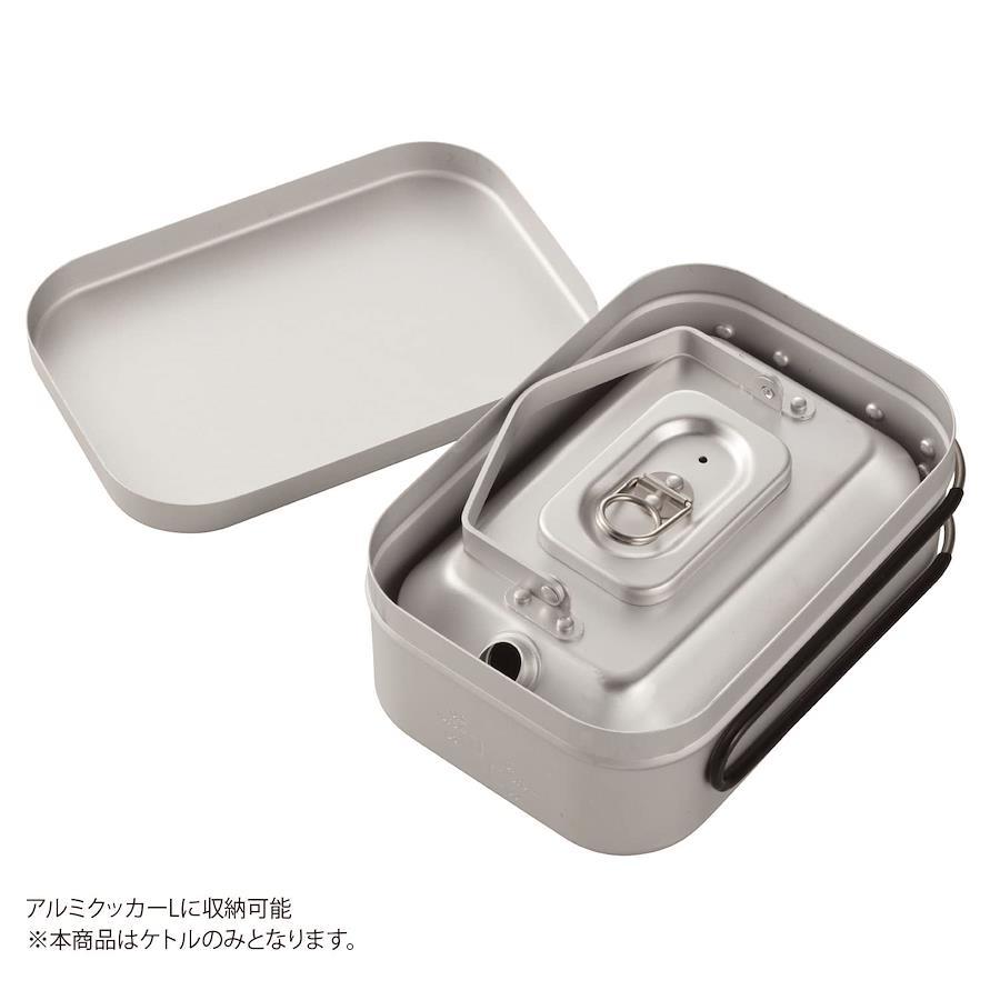 アルミクッカーL(品番:BD-908)に収納できる小型ケトル商品サイズ(約):W120xL183xH65mm(ハンドルを起こした時H125mm)重量(約):162g 満水容量(約):600ml材質:アルミニウム(アルマイト加工)生産国:中国