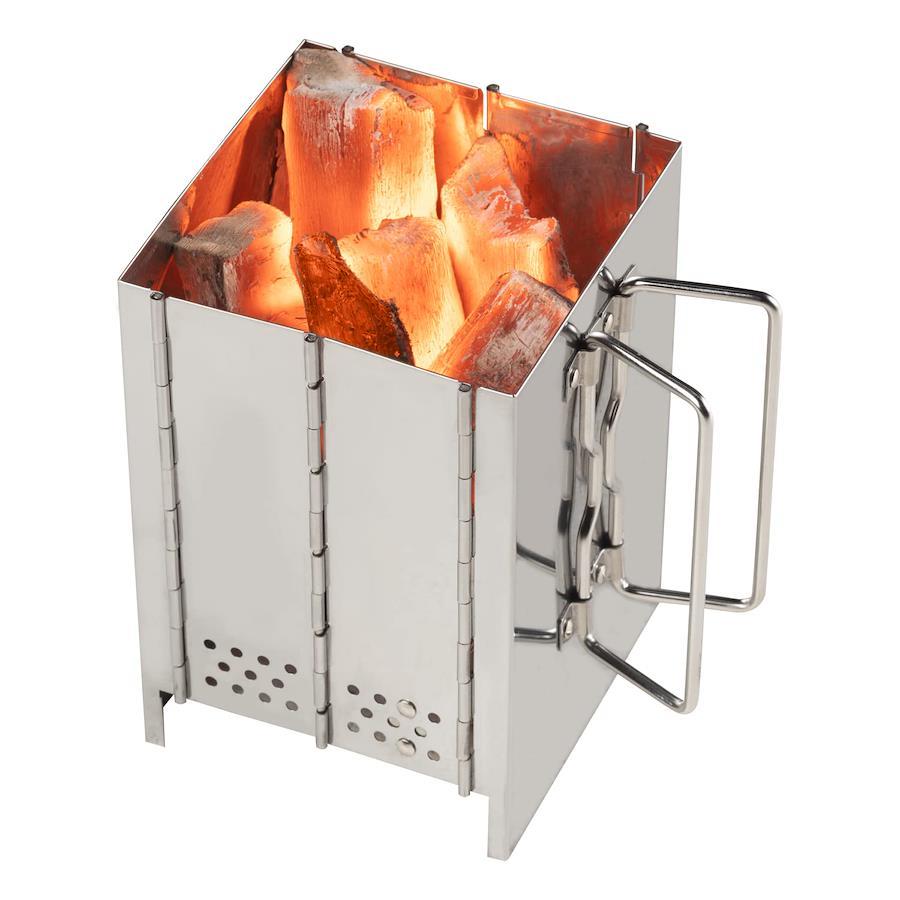 ●キャンプやバーベキューなどの木炭の火おこしに●角型なので、炭をまんべんなく詰められ、折りたたみができ、持ち運びに便利です