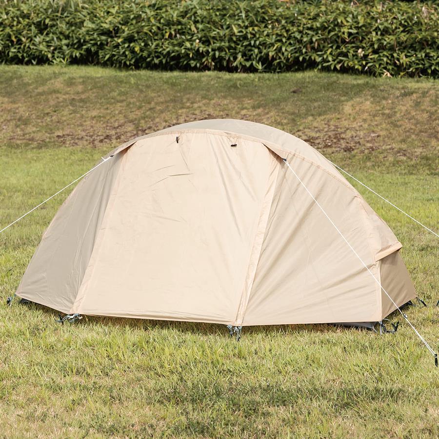 カラー:ベージュ一人用・耐水圧:約3000mmサイズ(約):フライ/W200xD150xH110cm・インナー/W200xD90xH100cm・収納時/W38xD15xH15cm材 質:シート:ポリエステル・インナー:ポリエステルメッシュ・フレーム:アルミ合金重量(約): 1.88kg組立式・収納ケース付シーム加工・ベンチレーション・ギアハンモック・小物入れポケット付セット内容:フライシートx1、インナーシートx1、メインポールx2、フレーム補助ポールx1・付属品/ペグx11、ロープx4、収納ケースx1生産国:中国