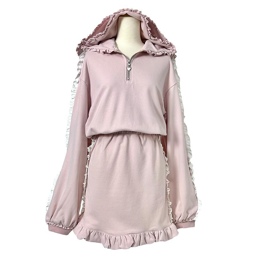 フリルたっぷりでボリューミーなフードと、ふりふりのサイドラインが可愛い、デザインたっぷりな1枚。