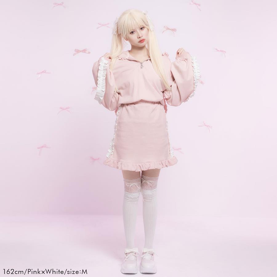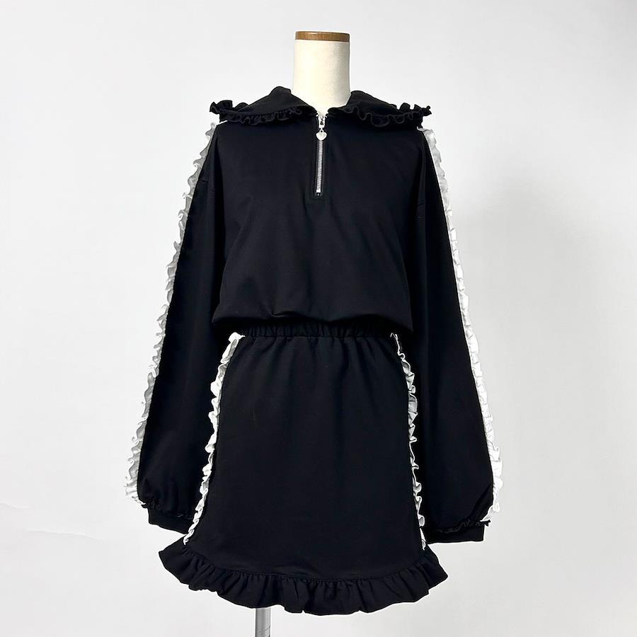 フリルたっぷりでボリューミーなフードと、ふりふりのサイドラインが可愛い、デザインたっぷりな1枚。