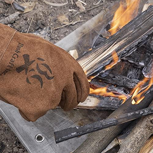 キャンプでの焚き火や調理の際に、熱さから手を守る牛革グローブです。しなやかなオイルレザーの床革で作られています。軍手のように手首まで覆う脱着のしやすいショートタイプ。ほどよい厚みで手指が動かしやすく、火の管理だけではなく薪拾いや薪割り、料理などの幅広い作業に向いています。内縫い仕様で、熱によって縫糸が焼ききれることもありません。また、裏地付きですので装着感も良く、耐熱性にも貢献しています。