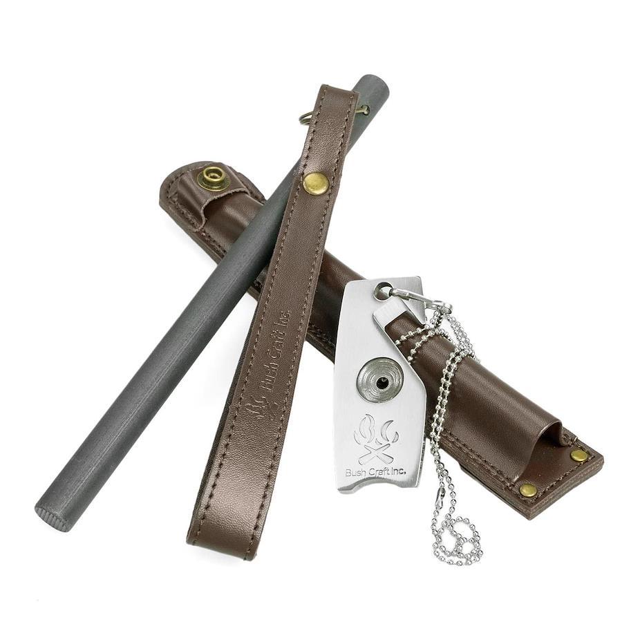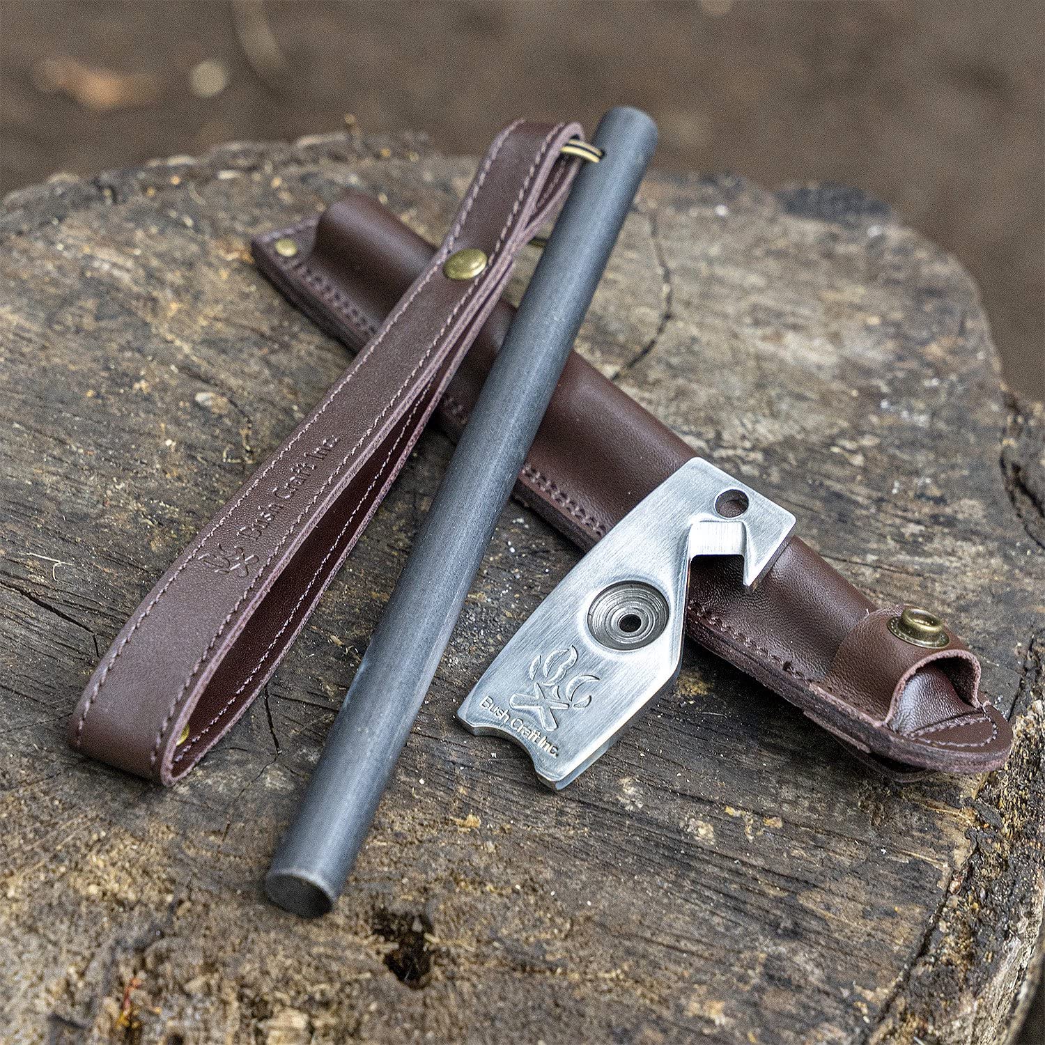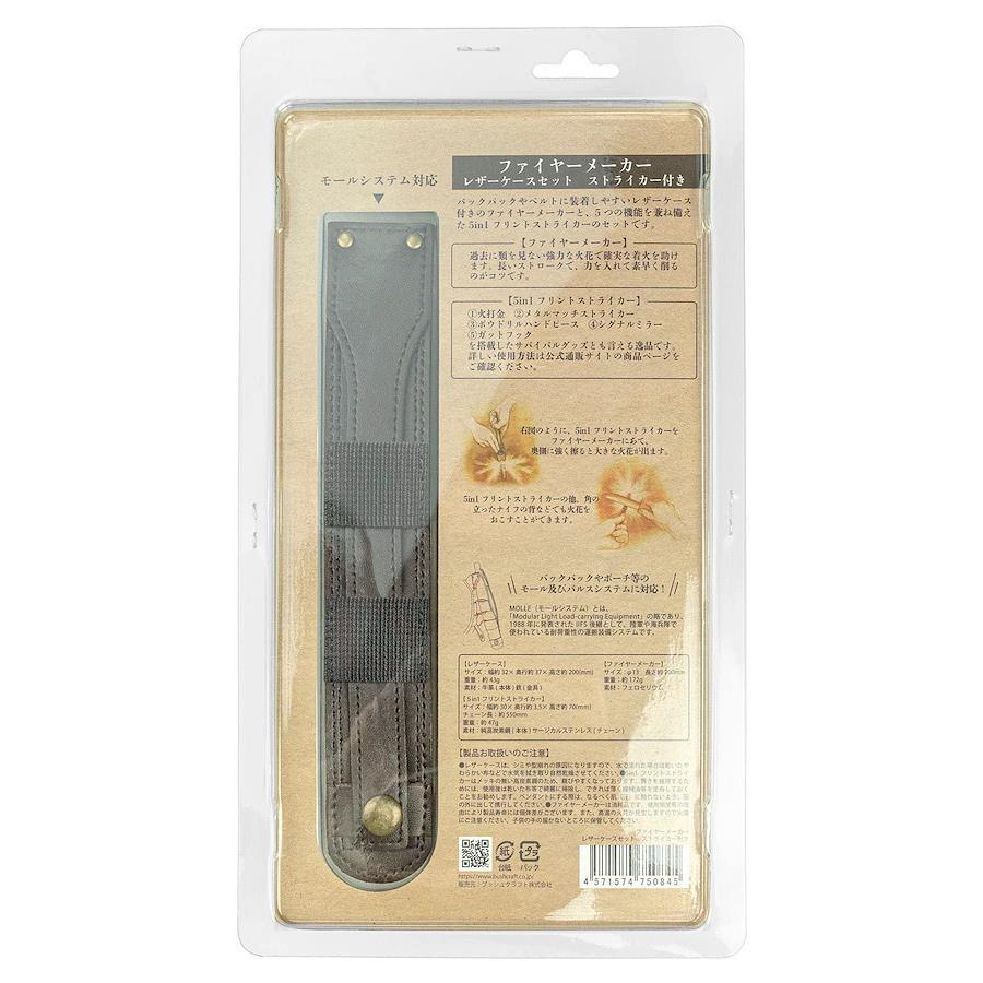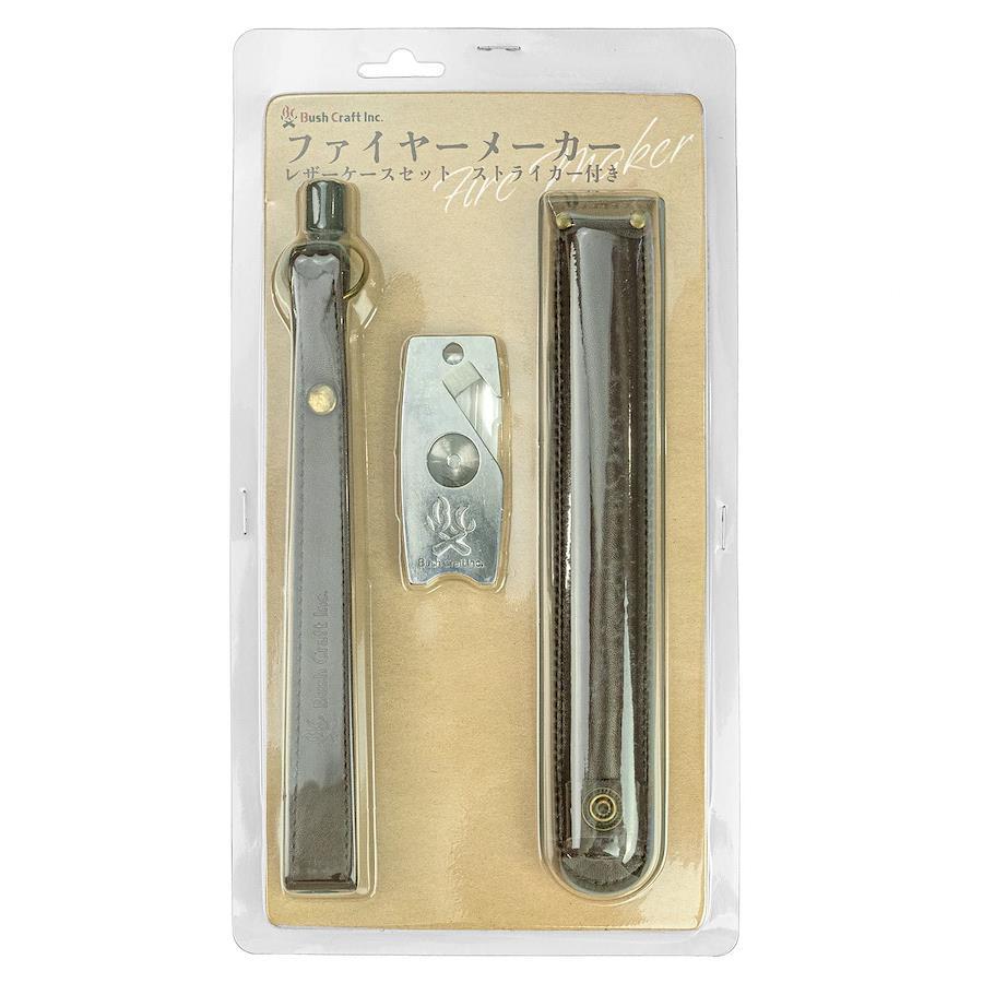 大好評のファイヤースチール&ストライカーが、シックなレザーケースとセットになりました。ベルトやバックパックに装着できるモールシステムに対応しています。※MOLLE(モールシステム)とは、「Modular Light Load-carrying Equipment」の略であり、1988年に発表されたIIFS後継として、陸軍や海兵隊で使われている耐荷重性の運搬装備システムです。【ファイヤーメーカー】攻撃的なまでに長大なロッドは、確実な火おこしを約束します。このサイズを活かすには、対象に押し付けるようにして保持し、長いストロークで擦ることです。初めから一発では着火しにくいことが分かっている対象なら、何度も連続してゴリゴリ削ってみてください。ブッシュクラフトファイヤーメーカー最大の特徴は、そのロッドストロークから来る『長持ち火花』です。新聞紙、コピー用紙、茶封筒、といった『紙』の類は通常の、『火花が飛ぶだけ』のメタルマッチでは、そのまま着火することができず、ナイフで毛羽立ちを作る等の工夫が必要でした。その点ファイヤーメーカーは、長いストロークで連続スパークを繰り返すと、火花が対象の上でしばらく持続して燃え続けます。約3,000℃の火種が、紙の上に数秒間停滞するのです。これにより、コピー用紙や新聞紙が、いとも簡単に着火できます。もう、火口がなくたって大丈夫。ファイヤーメーカーを使うと火口の概念が変わります。ポケットのレシートがそのまま火口になるのですから。【製品取扱上のご注意】※本品は焚き火やアウトドア用ストーブ等に使用する着火道具です。屋外にてご使用ください。※本来の目的以外で使用しないでください。※高温の火花が発生します。火傷にご注意ください。※本品は消耗品です。使用頻度等の理由により製品寿命には個体差がございます。※子供の手の届かないところに保管してください。