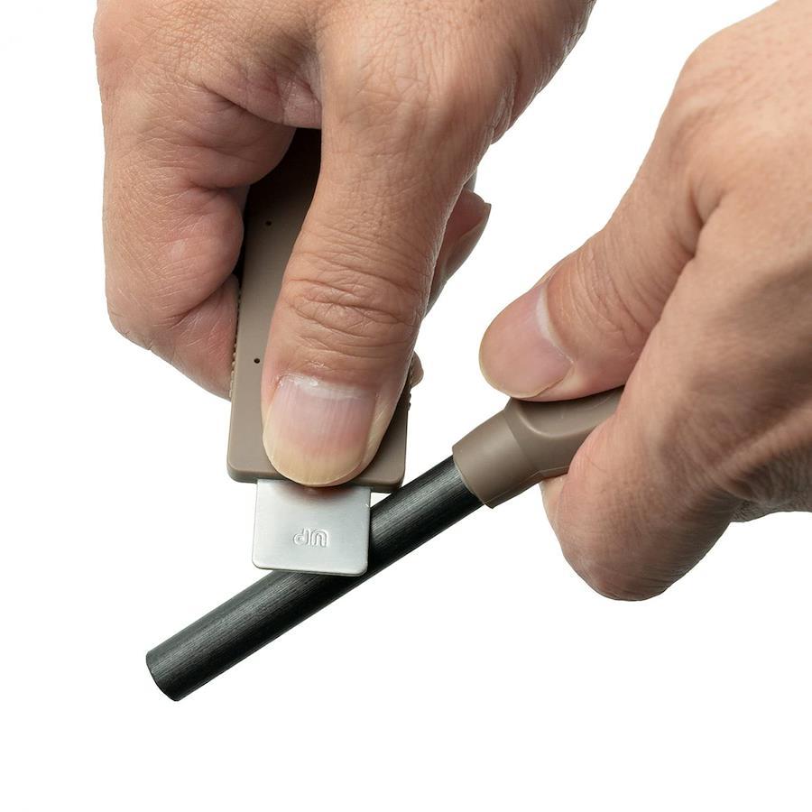 BushCraftInc.のメタルマッチプロのストライカーが強化されてリニューアル!ブッシュクラフトの必需品として発売以来、多くのユーザーに使用されているBushCraftInc.のファイヤースチール(メタルマッチ)。そのファイヤースチールがより使いやすくなってリニューアルされました。ロッドを擦るストライカーを大幅変更。従来品よりもより握りやすく、力を込められるようになった為、より大きな火花が出せるようになりました。