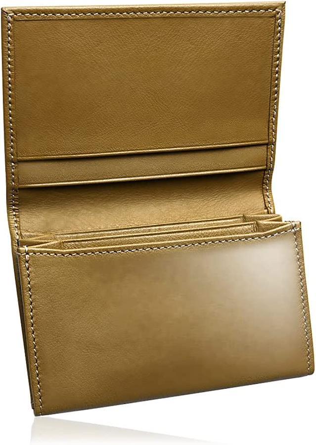 メインポケットは本体の底がすぼまって、スッキリとしたフォルムの風琴マチタイプの名刺入れです。