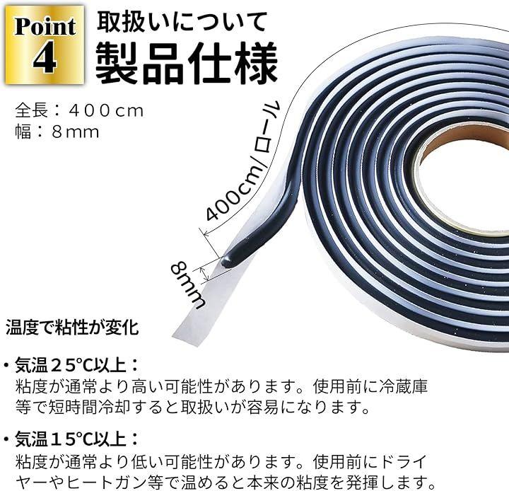 ・「仕様」内容:1本(長さ4m/太さ約8mm)、材質:合成ブチルゴム(耐熱・耐寒:-30~120℃)、*使用前に表面の汚れ、油分を取り除いてください。