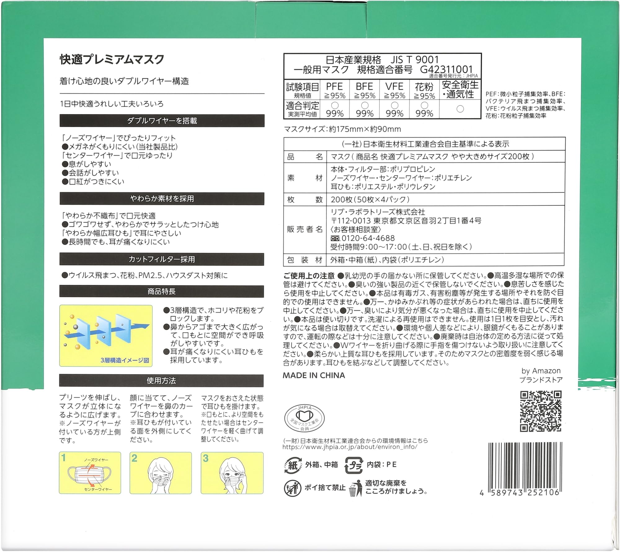 ・口紅がつきにくい●しっかりとした3層構造で、ホコリや花粉をブロックします。