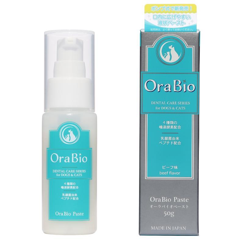 ・「オーラバイオペースト」は、ラクトフェリンやリゾチームなど4種の唾液酵素を配合し、清掃剤には卵殻由来のアパタイトを配合しました。乳酸球菌培養エキス(ナイシンA)も配合した合成保存料などを使わない、ペットのお口に優しい歯磨き剤です。