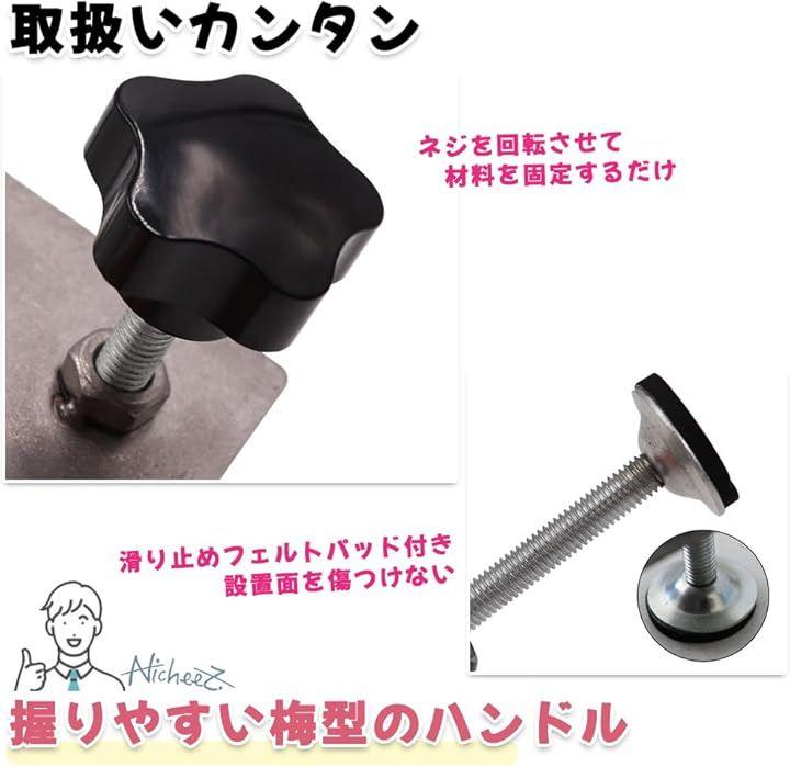 「取扱いカンタン」握りやすい梅型のハンドルを回し、ネジ部を回転させて挟んだ材料を固定します。